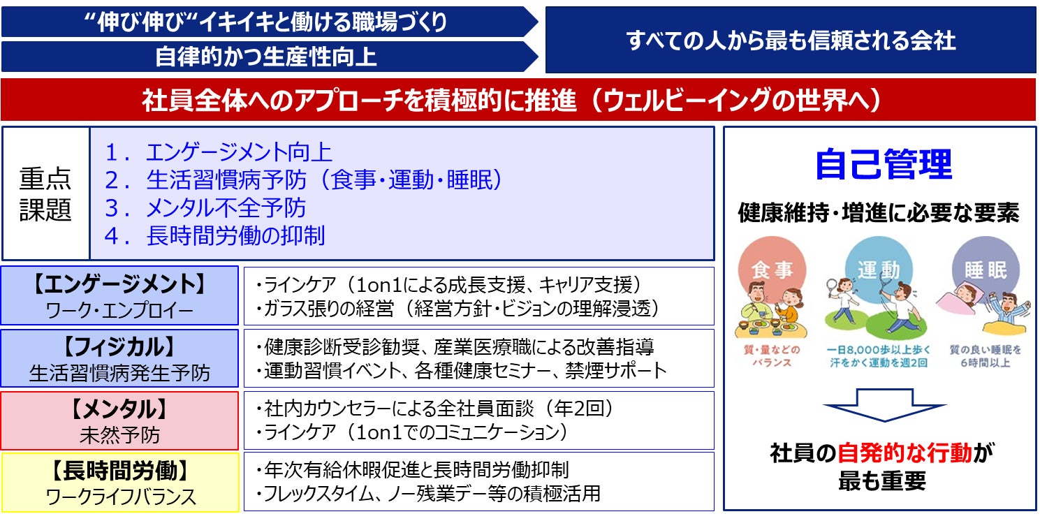今回の認定を受け、当社では、より一層社員一人ひとりの心身の健康の保持・増進を実現するとともに、社会から信頼され愛される企業を目指し、健康経営の実践に全社一丸となって取り組んでまいります。