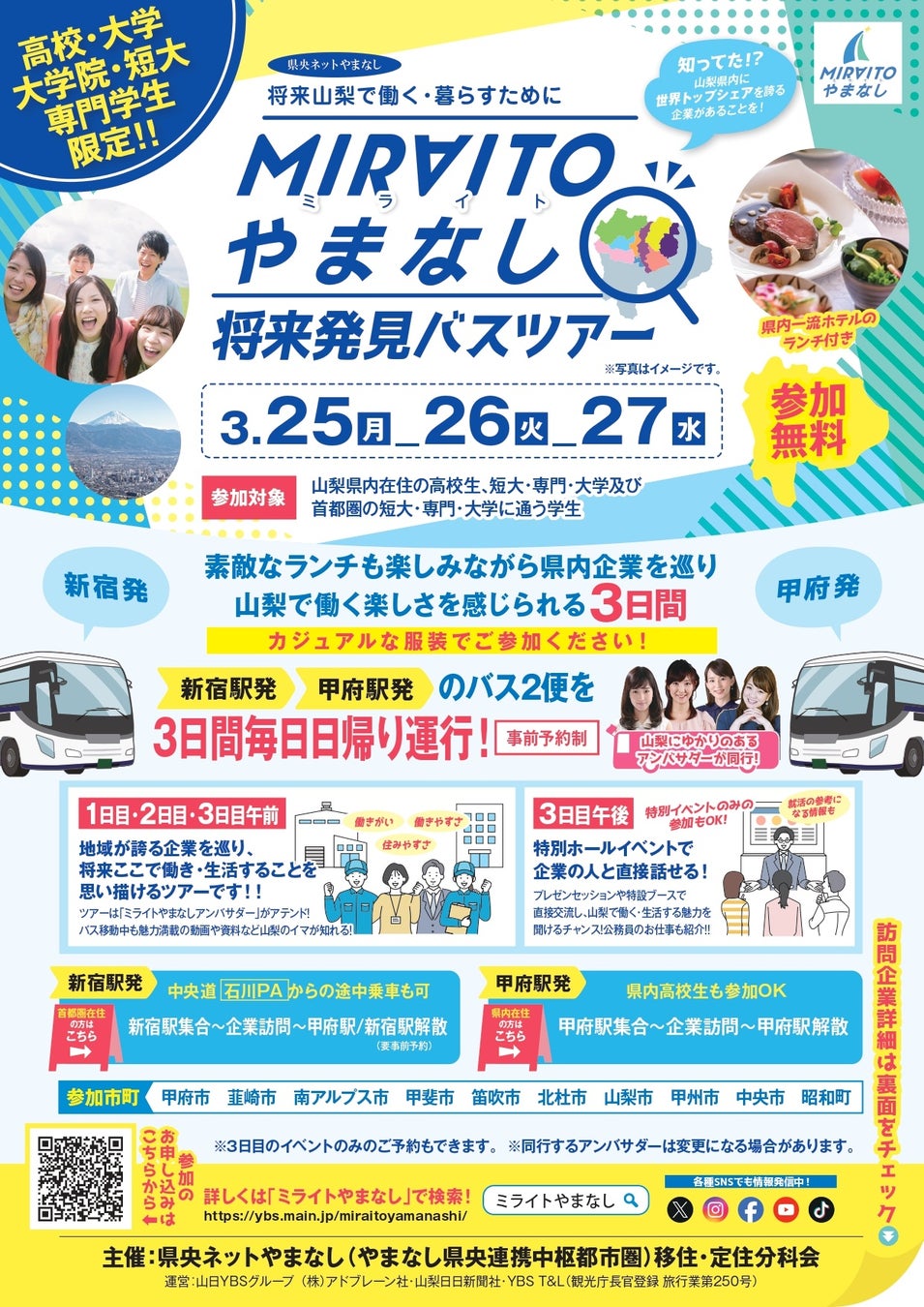 山梨県内や首都圏の学生向けに、「ミライトやまなし将来発見バスツアー」が3月25,26,27日の3日間にわたり開催されます。このバスツアーは、山梨の住みやすさや働きやすさを就職前の学生に肌で感じてもらうことを目的としています。参加者は朝、新宿駅西口・甲府駅それぞれを出発し、山梨県内で先進的な取り組みや令和らしさを秘めた企業を見学しながら、山梨での生活や仕事を体験することができます。さらに、山梨の魅力体験の一つとして、県内の有名なホテルや観光地で美食も楽しむことができます。バスには元山梨県の局アナである経験豊富なアンバサダーが1台に1名同乗し、参加者に山梨の魅力を伝えます。