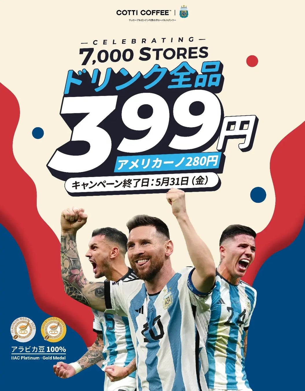 2月26日、アルゼンチン国家サッカーチームのグローバルスポンサーであるCOTTI COFFEE(コッティコーヒー)は、全世界の店舗数が7,000店に達したことを記念し、5月31日までの期間限定で「ドリンク全品399円、アメリカーノ280円」という新たなプロモーションキャンペーンを行うことを発表しました。