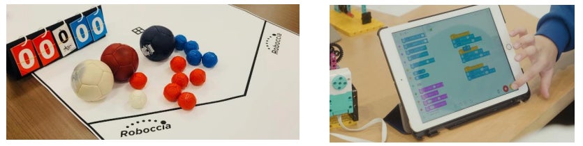 ロボッチャ®1/10部門は、ボッチャの1/10サイズの競技コートとボールを使用し、投球用のオリジナルロボットをつくり、プログラムを組んでゲームを進行します。競技者は、チームを作り、オリジナルロボットを組み立て、一投ごとにプログミングで指示を与えて投球を行います。