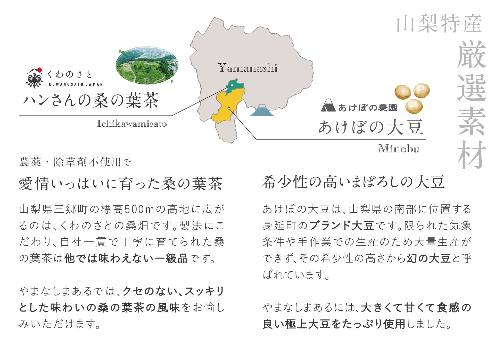 原材料には、極上大豆「あけぼの大豆」と、ミネラル・食物繊維が豊富な「桑の葉茶」が使用され、山梨県の特産品を贅沢に味わえます。