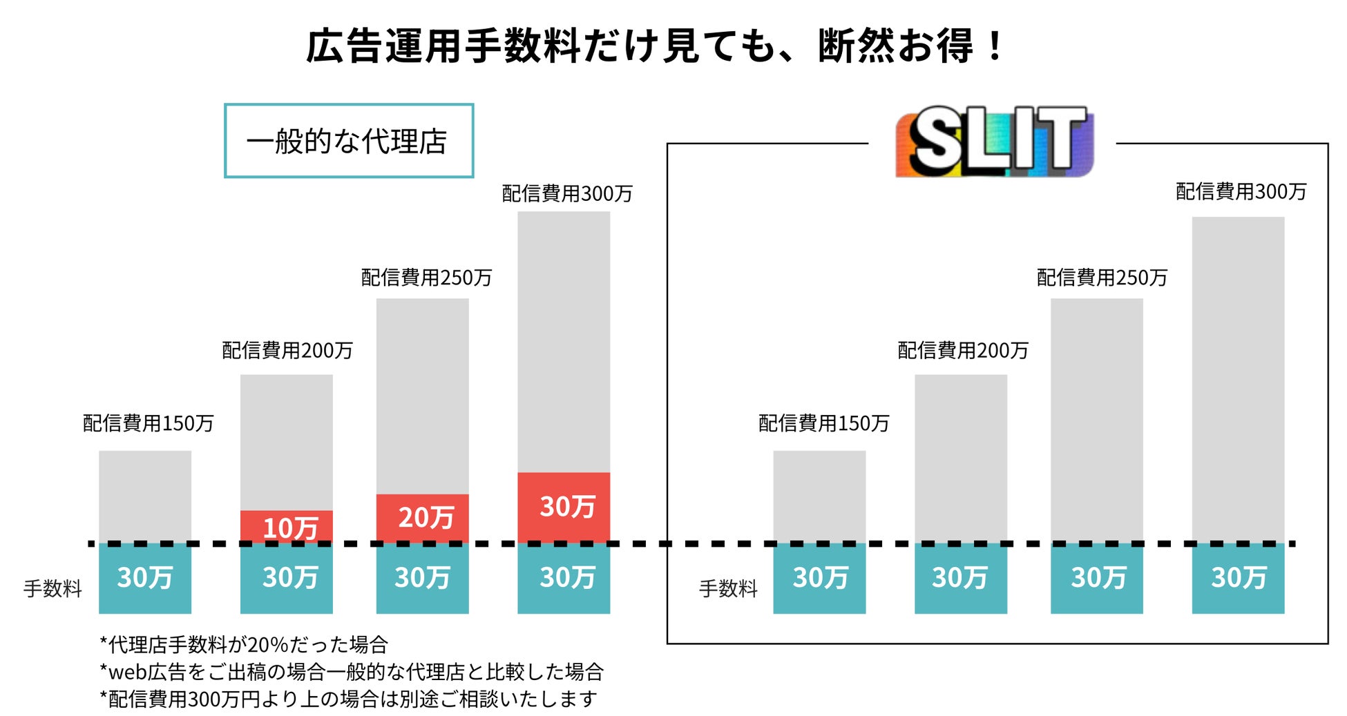 『SLITコンサルティング』は一般的なweb広告代理店が行う「広告配信費用に対して手数料〇〇%」という形式ではなく、マーケティングインハウスを前提とした支援を月額固定30万円〜でご提供しております。広告運用においては、競合調査・ポジショニング・戦略設計・配信媒体選定に加え、運用体制構築までサポートしております。