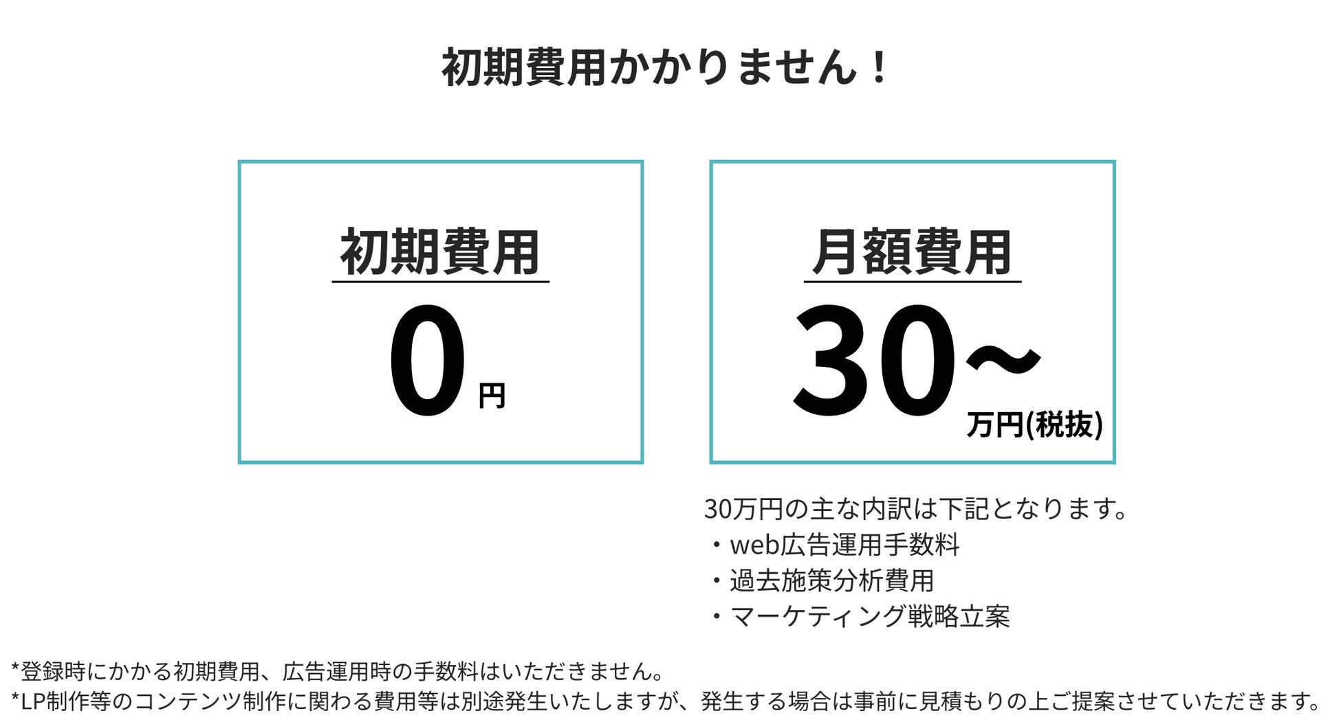 ※web広告配信費用は月額300万円(管理画面上の金額)までのが月額30万円(税抜)の範囲内になりますのでご注意ください。