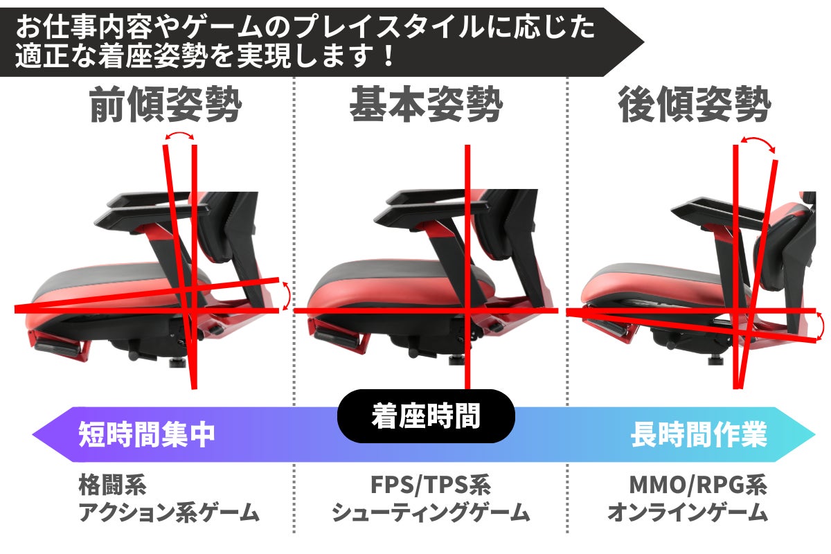 「TG-01」は、自動車用RECAROシートのような適度な硬さを持ち、レーシングカーを思わせる流線的なデザインと、太ももの圧迫感を軽減する座面クッションの硬さで、快適性を追求しています。また、PUレザーを使用した座面は通気性も確保し、座面角度の調整により正しい姿勢をサポートします。