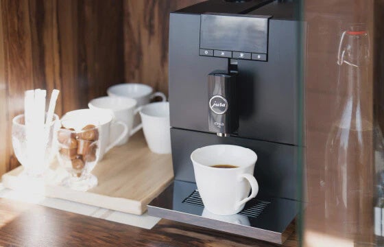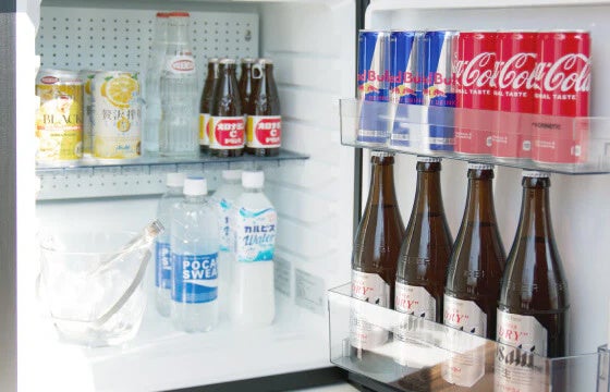 ソファの隣の棚には無料でご利用いただけるコーヒーマシンや、有料ドリンクの入った冷蔵庫などがございます。