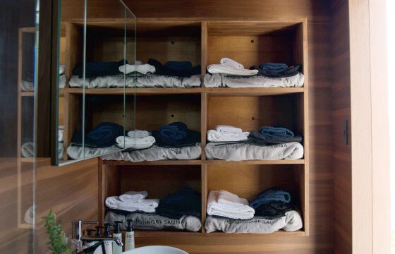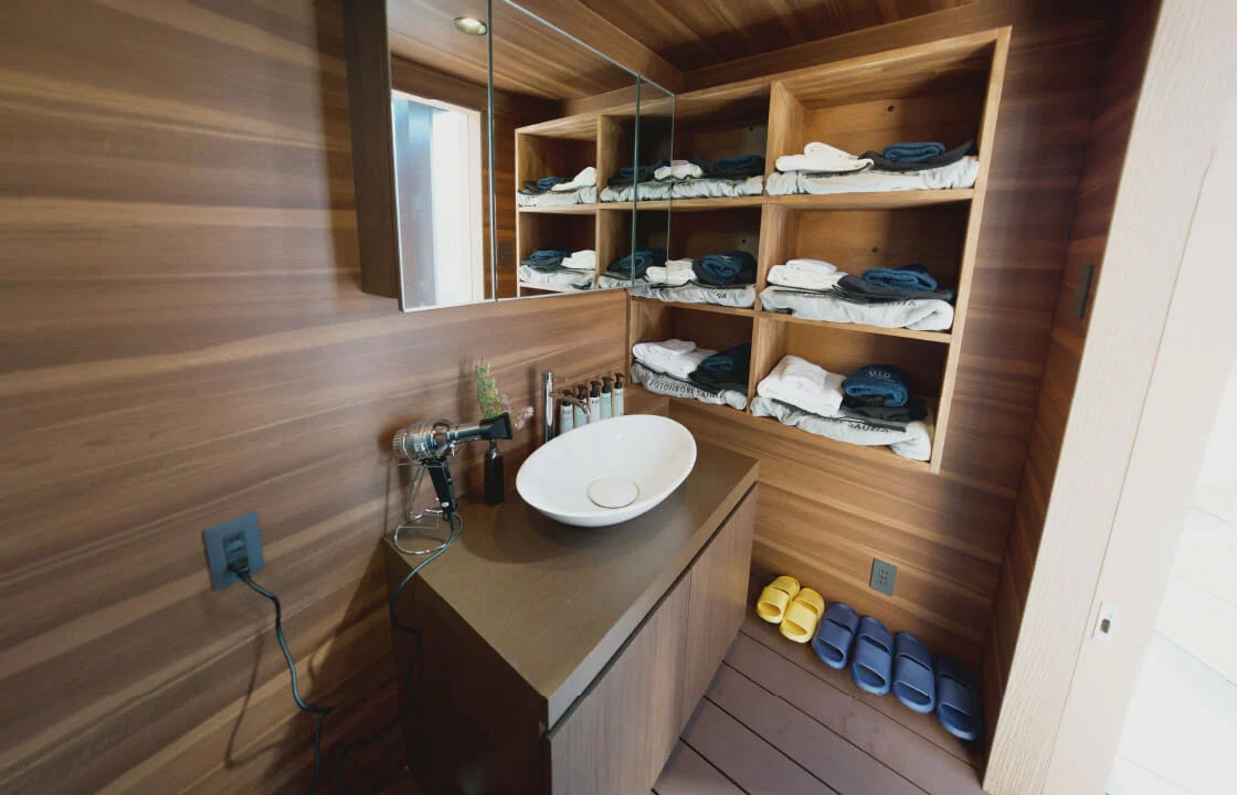 サウナハットやポンチョ、タオルなどはこちらにご用意しております。ヘアアイロンの貸し出しもしておりますので、チェックイン時にお申し付けください。
