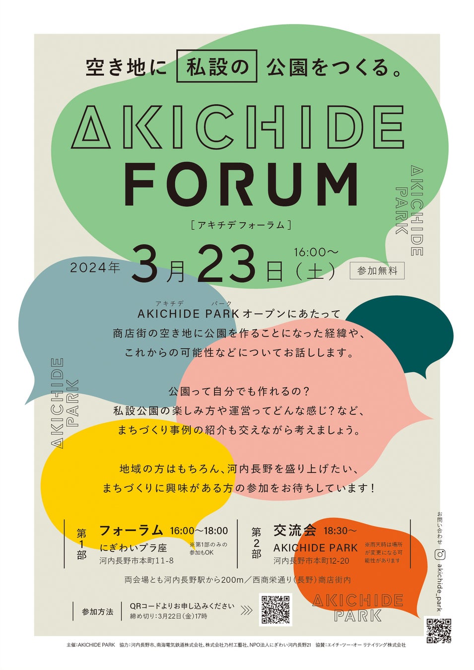 会場: 第1部:フォーラム/にぎわいプラ座 第2部:交流会/AKICHIDE PARK
