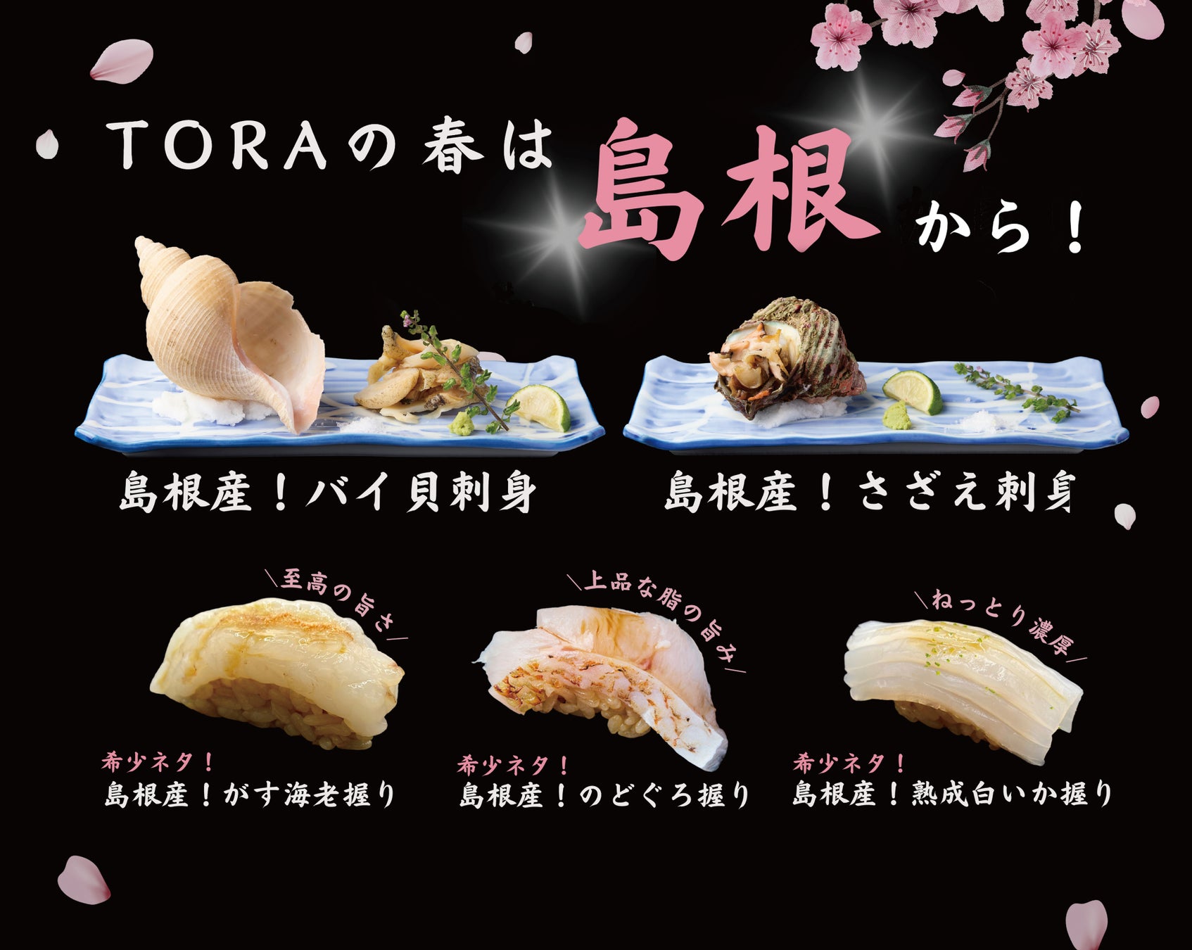 フェアと同時に期間限定で島根県産春の旬の鮨ネタと一品メニューをご提供しています。島根県は、日本海の美味しい魚貝が多いことで有名ですが、志を共にする水産加工会社(株)SOL JAPANからの直接買い付けで実現することができた島根県産の新鮮でおいしい魚、海老、貝をこの機会に是非、お楽しみください。