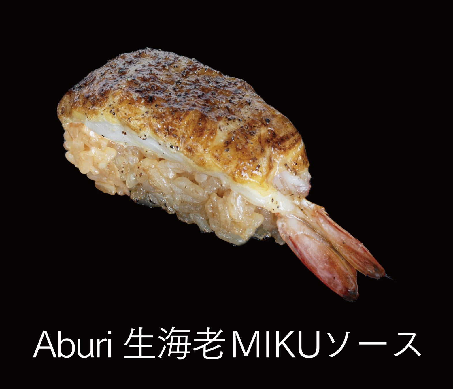 Aburi TORAオリジナルソースと生海老の相性は抜群で、噛んだ瞬間の確かな食感とともに、ソースの風味と香ばしさが口いっぱいに広がります。ネタとのマリアージュが新感覚のお鮨です。