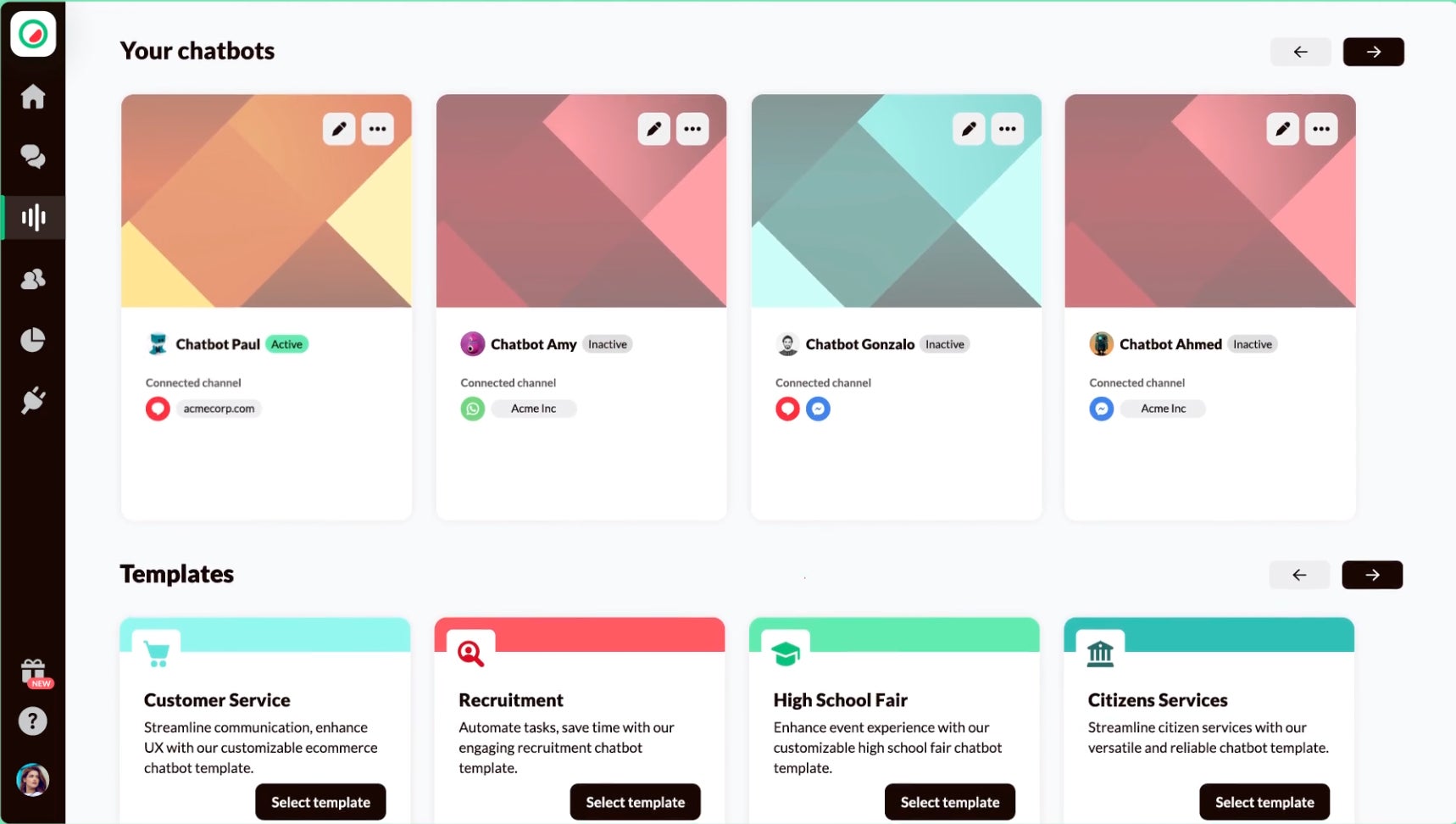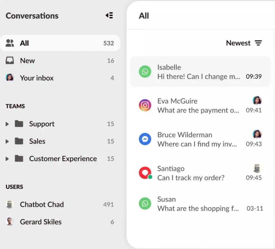 顧客タッチポイントの一元化 → 一度作成したチャットボットは、ウェブサイト、インスタグラム、Facebookメッセンジャー、WhatsAppなど様々なチャネルに実装でき、1つのダッシュボードですべてのメッセージに対応できます。