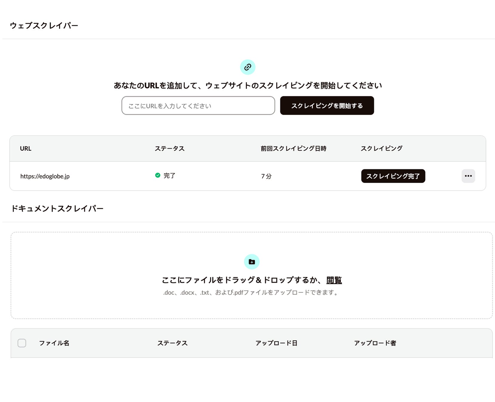 スクレイパーによる圧倒的なAIボット構築体験 → ウェブ・ドキュメントスクレイパー機能を搭載しており、サイトURLや資料を貼り付けるだけでAIが自動的に内容を学習してボットを作成します。