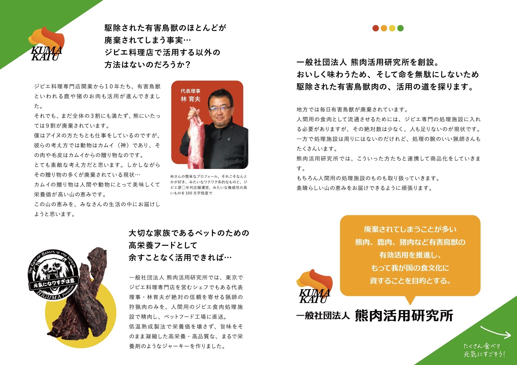 一般社団法人 熊肉活用研究所は、駆除された熊肉を有効活用し、人と動物が共存できる社会を目指して設立されました。