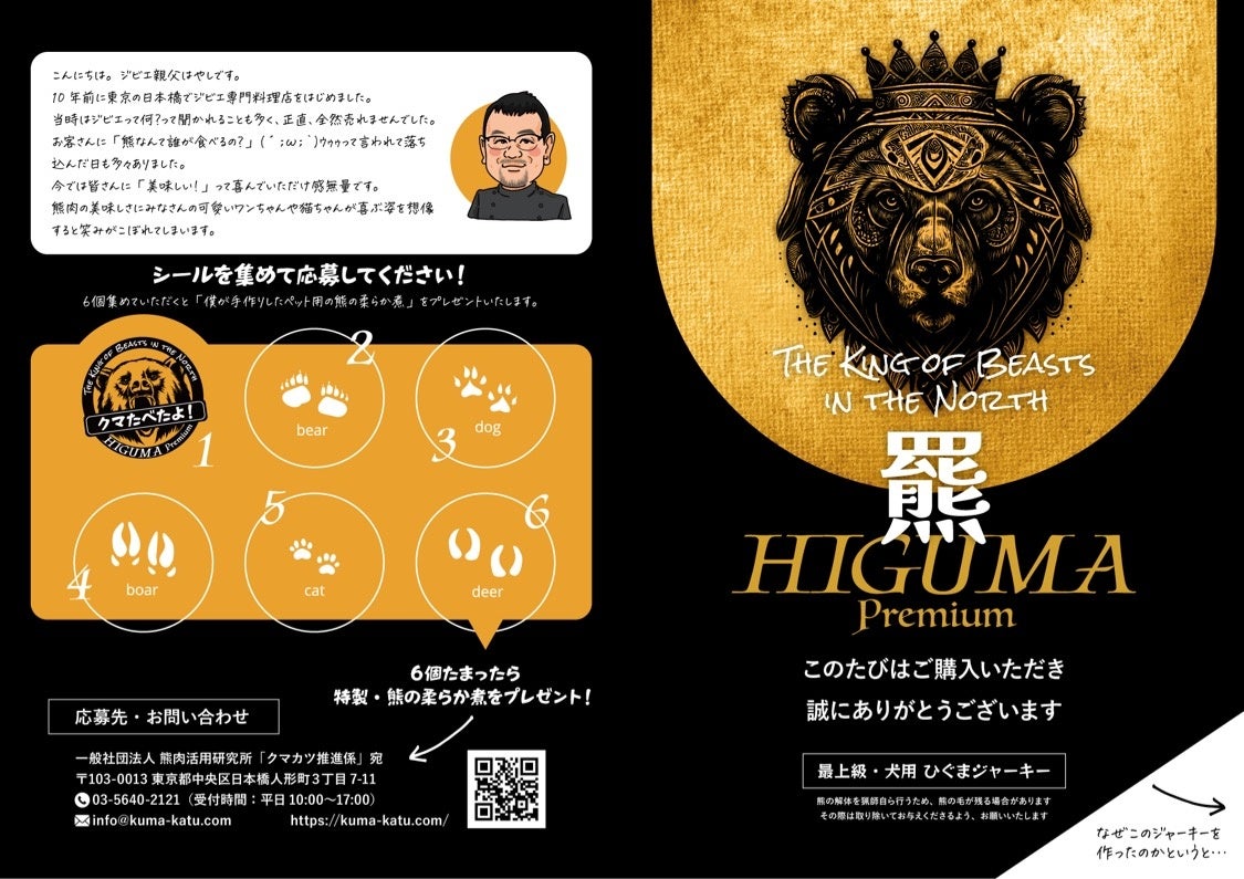 2024年4月1日 – 一般社団法人 熊肉活用研究所(東京都中央区日本橋人形町3-7-11理事長 林 育夫)は、上記の夢への第一歩として、ペット用ジャーキー「羆ジャーキー プレミアム」の発売を開始いたします。