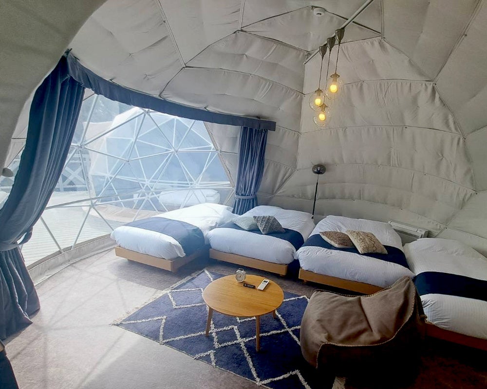 体験型グランピング施設での宿泊棟は最新ギアブランド『deluxs』デュラクス社製のドームテントを使用。