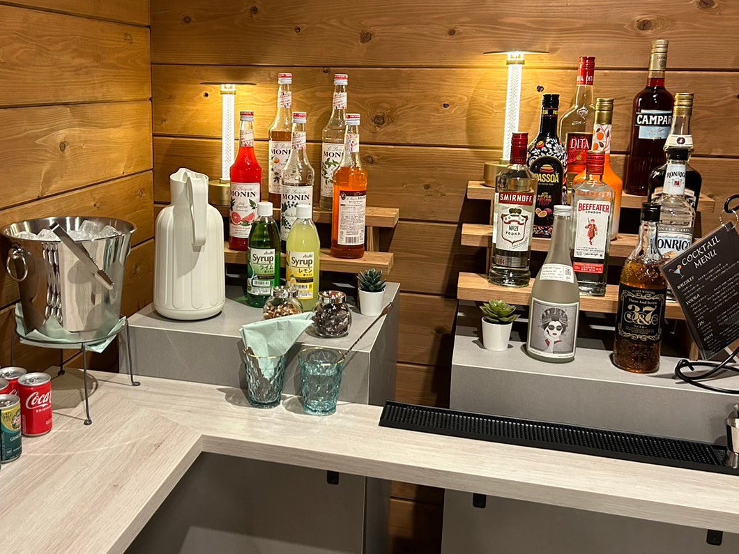 当施設オリジナルのレシピも制作し自分達で作るカクテルを楽しんで頂くと共に、ゲスト同士のちょっとした交流の場にも。