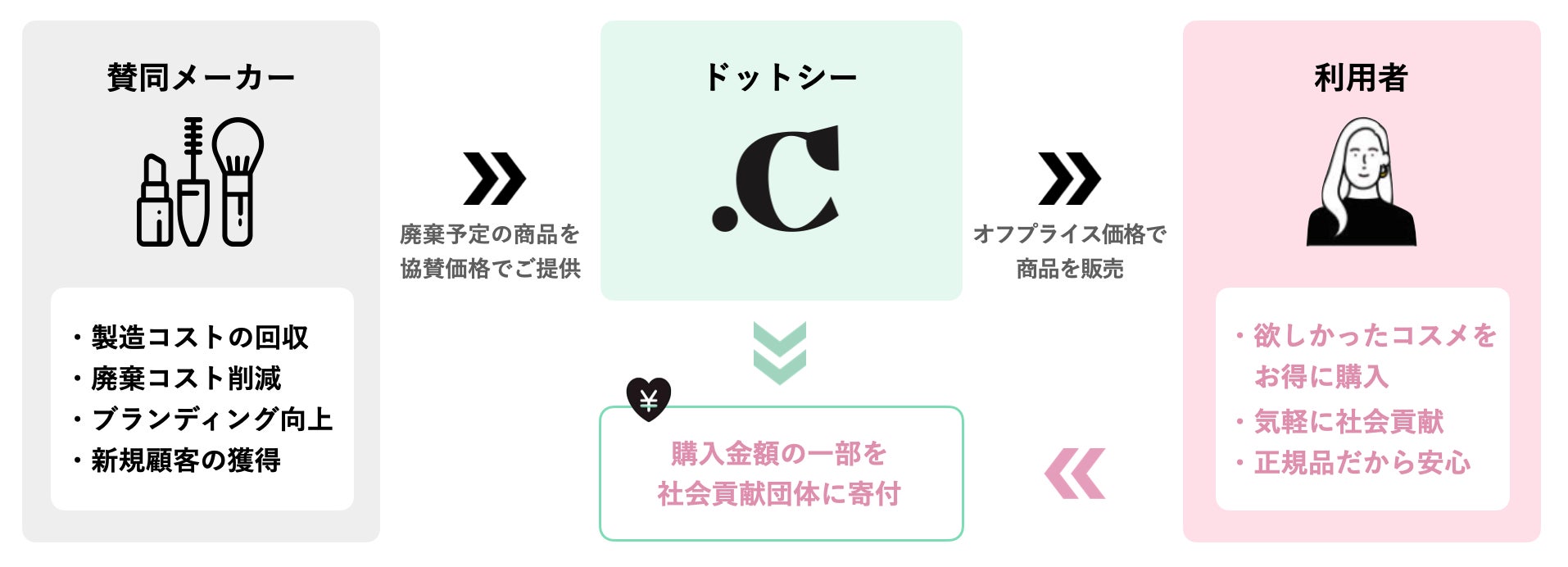 協賛企業(化粧品メーカー)は廃棄コストの削減につながり、利用者はお得に商品を購入できるだけでなく購入金額の一部が寄付されることで社会貢献につながります。