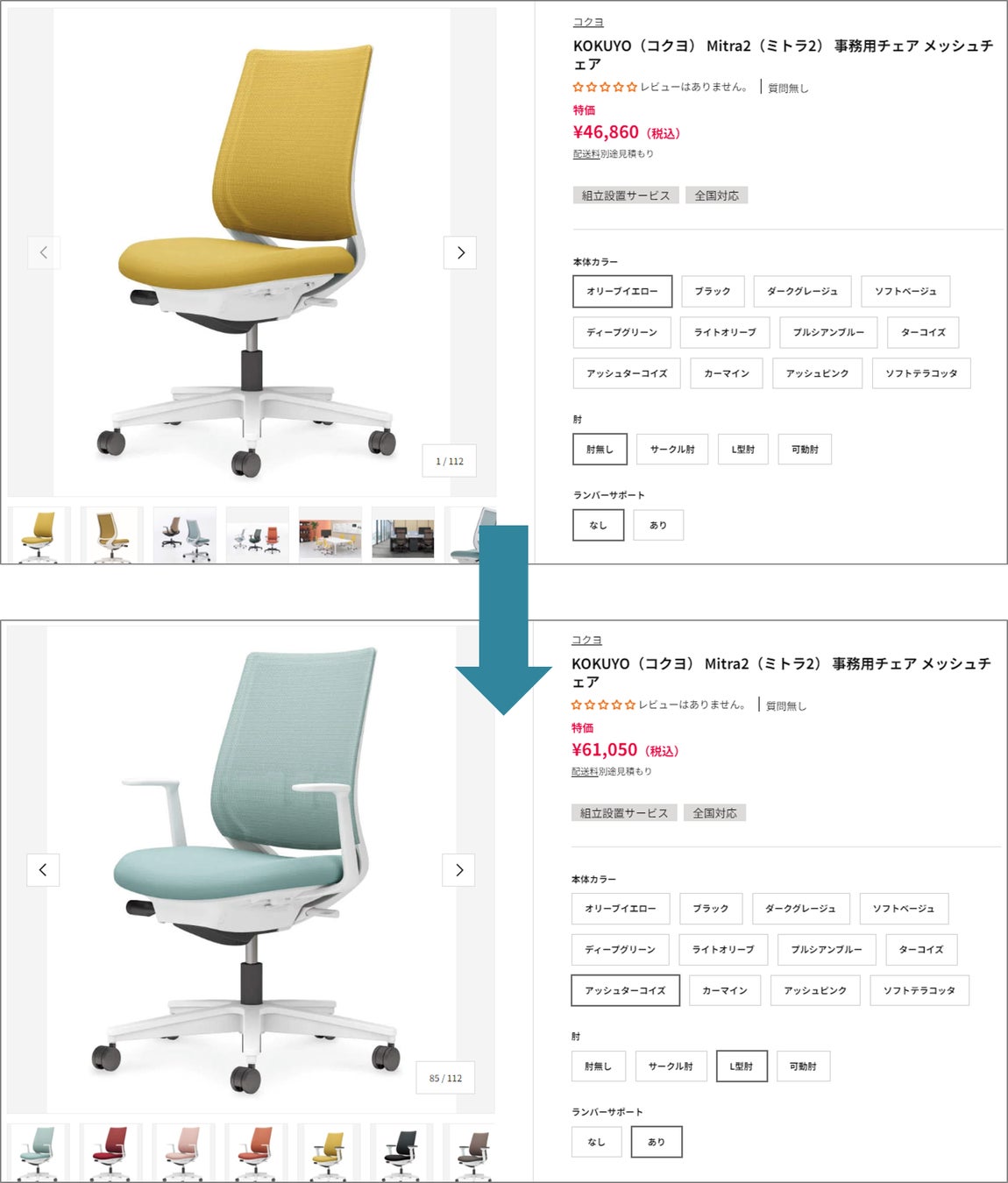 商品はカテゴリやメーカー、金額、カラー、サイズ等で絞り込むことができ、商品の選定がスムーズに行えます。また、同一商品のカラー変更やオプション追加はページ遷移が不要で、操作性の高いUIを実現しています。