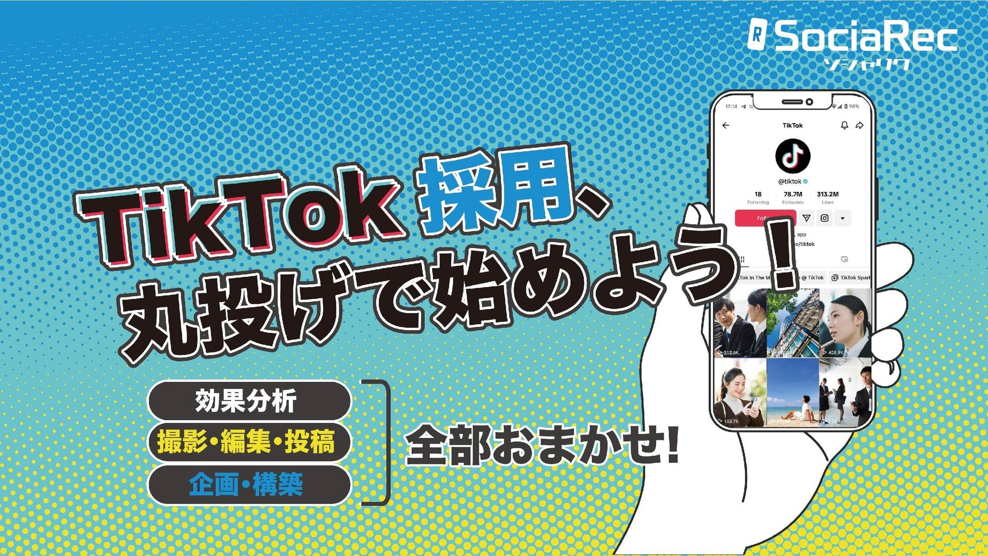SociaRecは、企業の魅力や価値観などをTikTokのショート動画を通して、分かりやすく発信する、攻めの採用ブランディングサービスです。