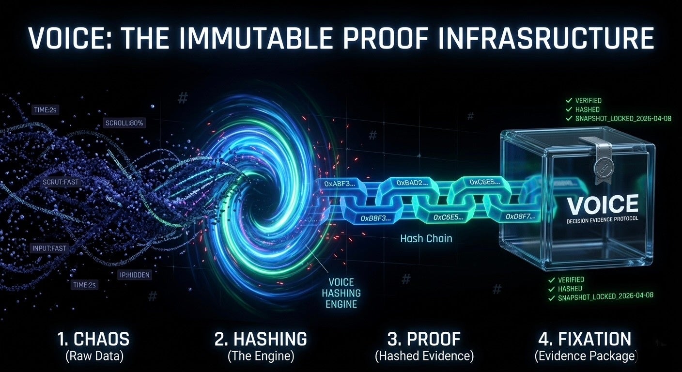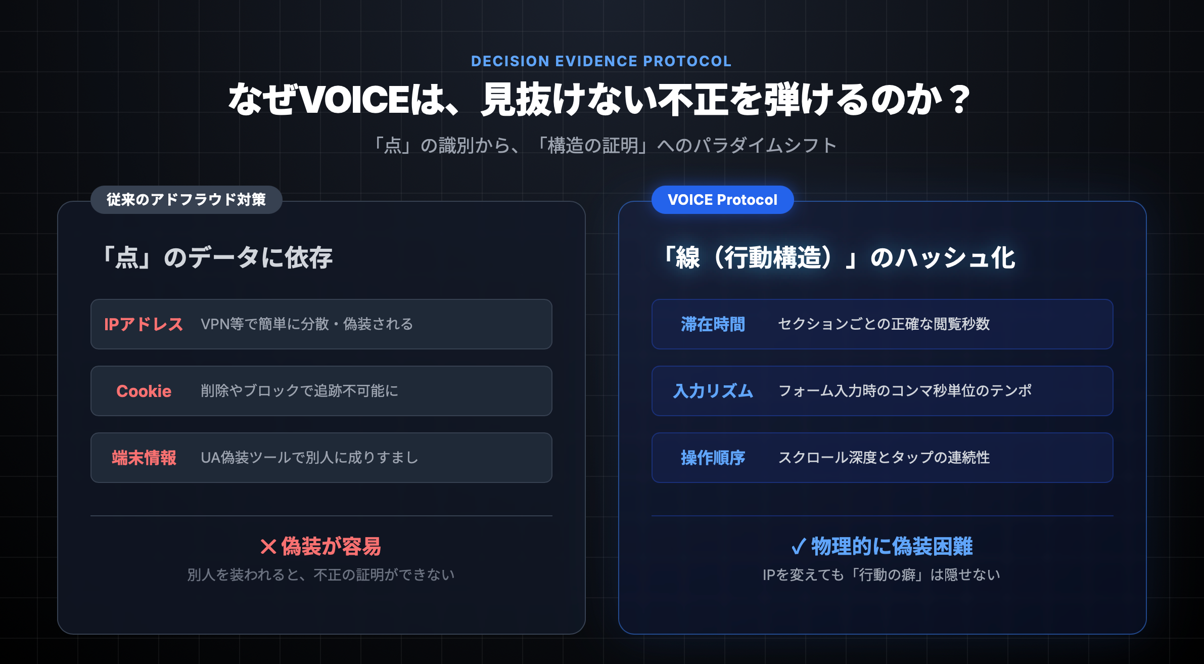 VOICEは、IPなどの単一情報ではなく、ページ滞在時間、入力テンポ、スクロール深度などの「行動構造」に着目します。 これらの連続した操作情報を組み合わせ、特定の条件下で統計的に再現性が高いパターン(クラスター)を抽出し、その構造を暗号学的ハッシュとして固定します。