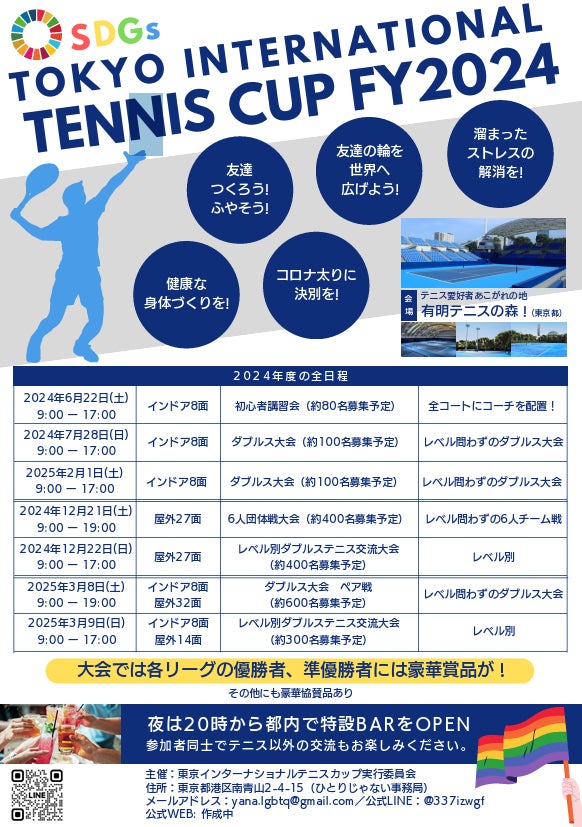 東京インターナショナルテニスカップは、日本各地や海外から集まるLGBTQ仲間でテニスを通して交流を楽しみ、仲間づくりおよび相互理解を深めるイベントです。