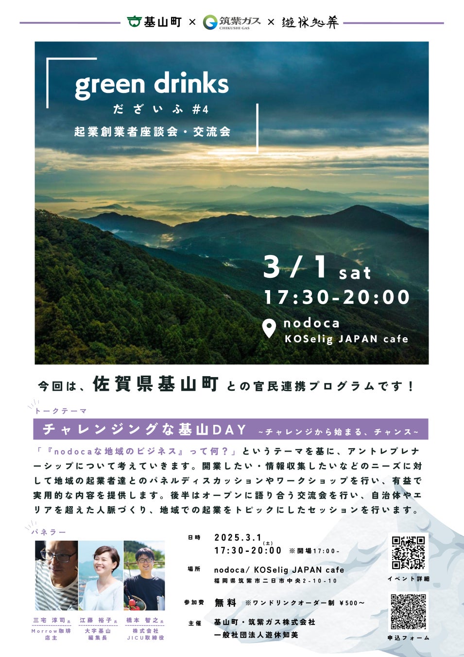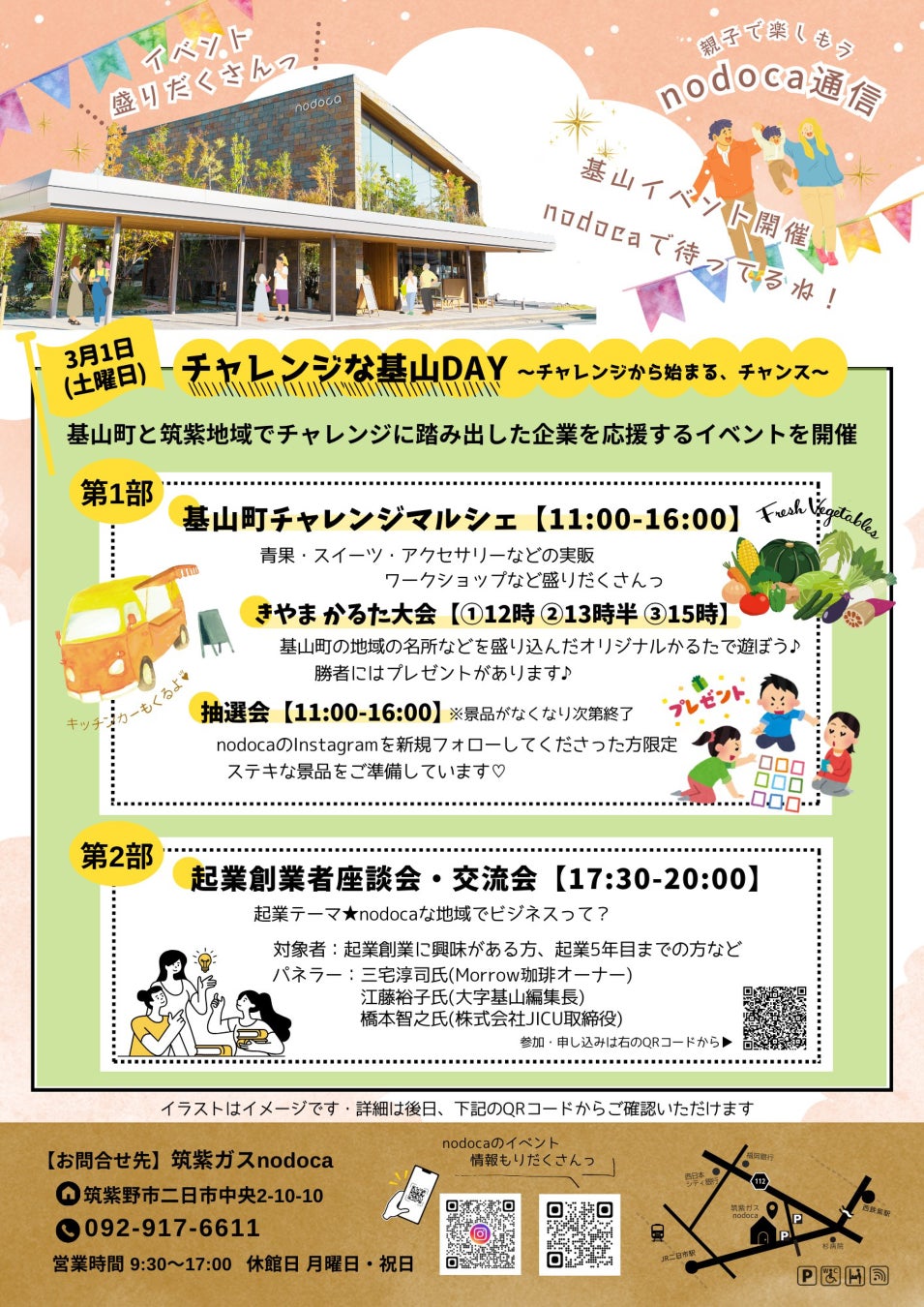 基山町、筑紫ガス株式会社、一般社団法人遊休知の共催で、筑紫ガスnodoca(ノドカ)において、チャレンジングに踏み出した起業家を応援するプログラム(第1部:マルシェで実販、第2部:起業家による交流会)を開催します。行政域の枠を超えて、nodoca(ノドカ)な地域で未来を作ろうとしている人たちが集う、官民連携の取り組みです。