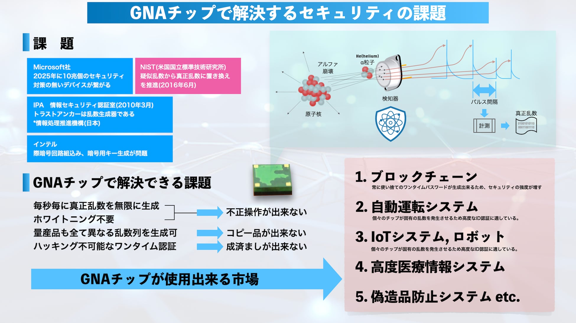 *GNAチップは、原子核のα崩壊が量子力学的にパリティ対称性を保ちつつ完全にランダムであることから真正乱数生成器として優れた特性を活かしたものです。これらは量子原理原則に基づいた人工的ではない自然乱数生成が可能で、秒間70兆個もの異なる乱数を発生させることが出来ます。乱数は使い捨てできるため、量子耐性を持つ非常に高いセキュリティを提供することが可能となります。因みにNISTは擬似乱数から真正乱数への移行を推奨しています。