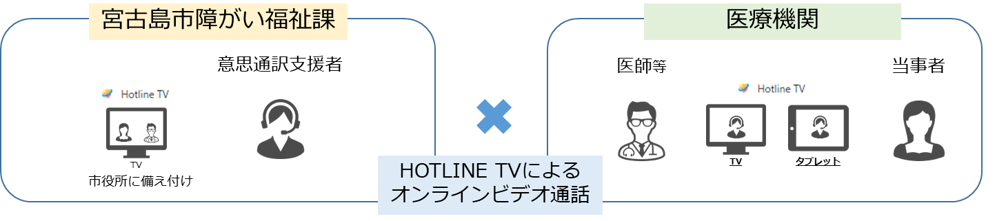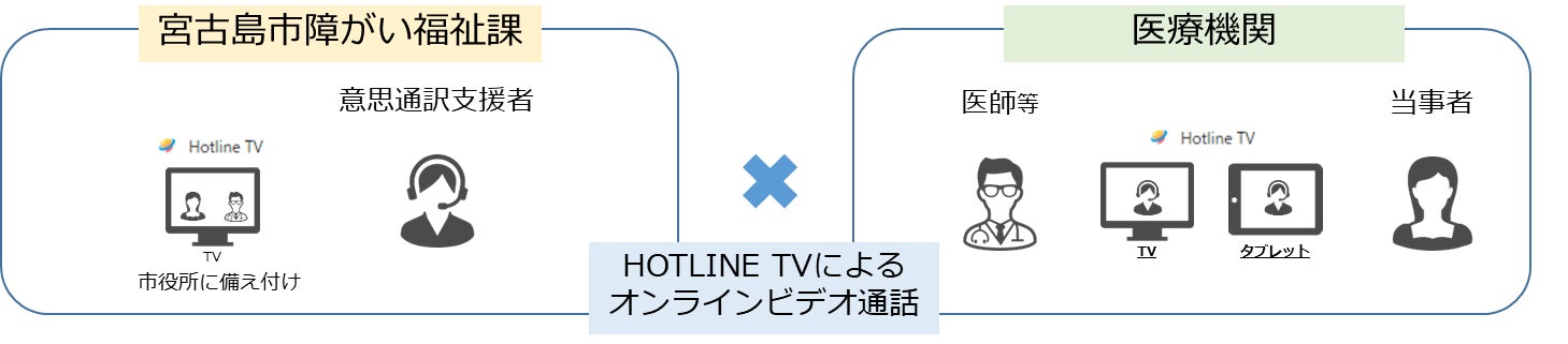 この手話通訳を始めとする意思疎通支援サービスは、エラン|HOTLINE TV®を活用したもので、宮古島市役所内に設置のテレビと、医療機関に設置したテレビやタブレットを接続し、手話通訳等の意思疎通支援を行います。通信環境さえあれば、場所を選ばずに利用することが可能で、手話通訳などを受ける時間が柔軟に選択できるようになります。