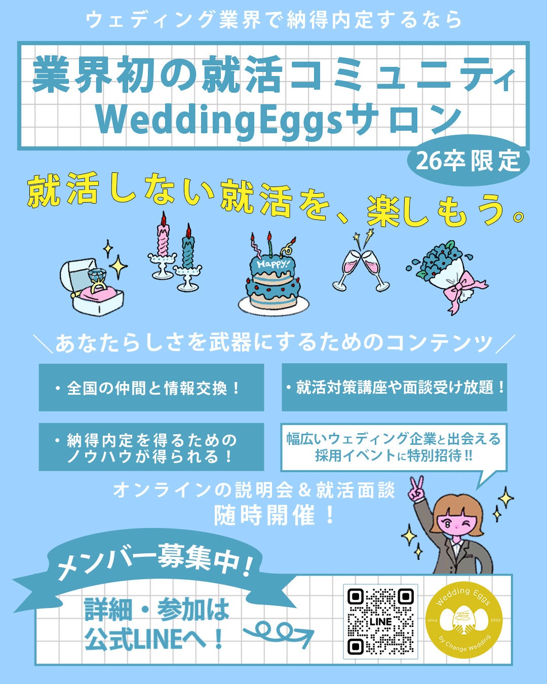 24年4月1日よりブライダル業界志望の就活生のための就活コミュニティ、WeddingEggsサロンがオープン&ブライダル企業と学生を繋ぐ逆採用イベントも今秋開催