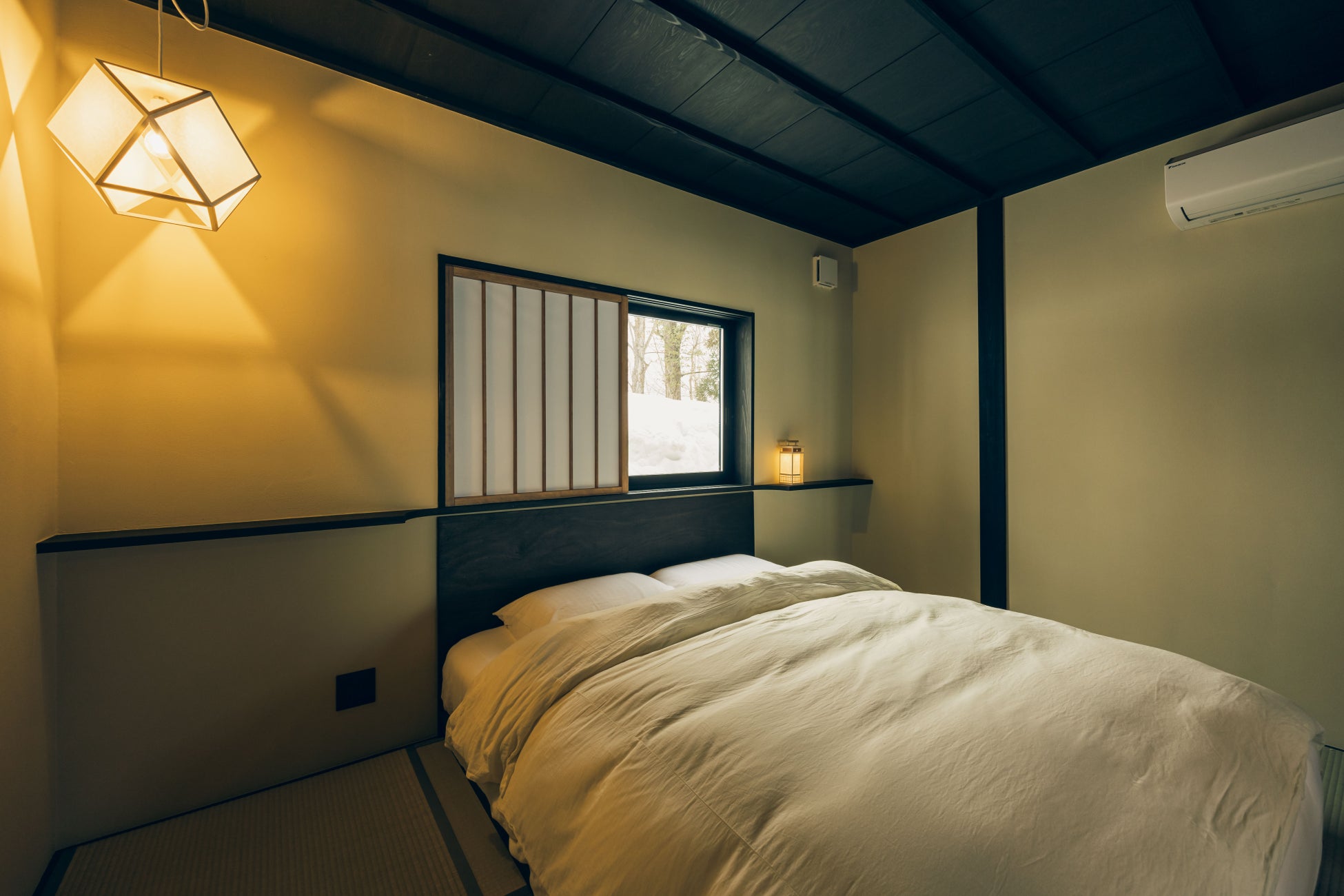 豪雪地域の古民家の本来の基礎や建具を丁寧に保持しながら、雪国の歴史と風土を感じられるように再生されました。レイアウトでは、元の古民家にあった床の間や雪見障子、昔の竿縁天井が継承され、雰囲気を最大限に活かしながら寝室やお風呂などは快適に改修し、くつろげる空間を提供しています。台湾から直送したぐっすり眠れる寝具 (Sleepy Tofu) もご用意しています。