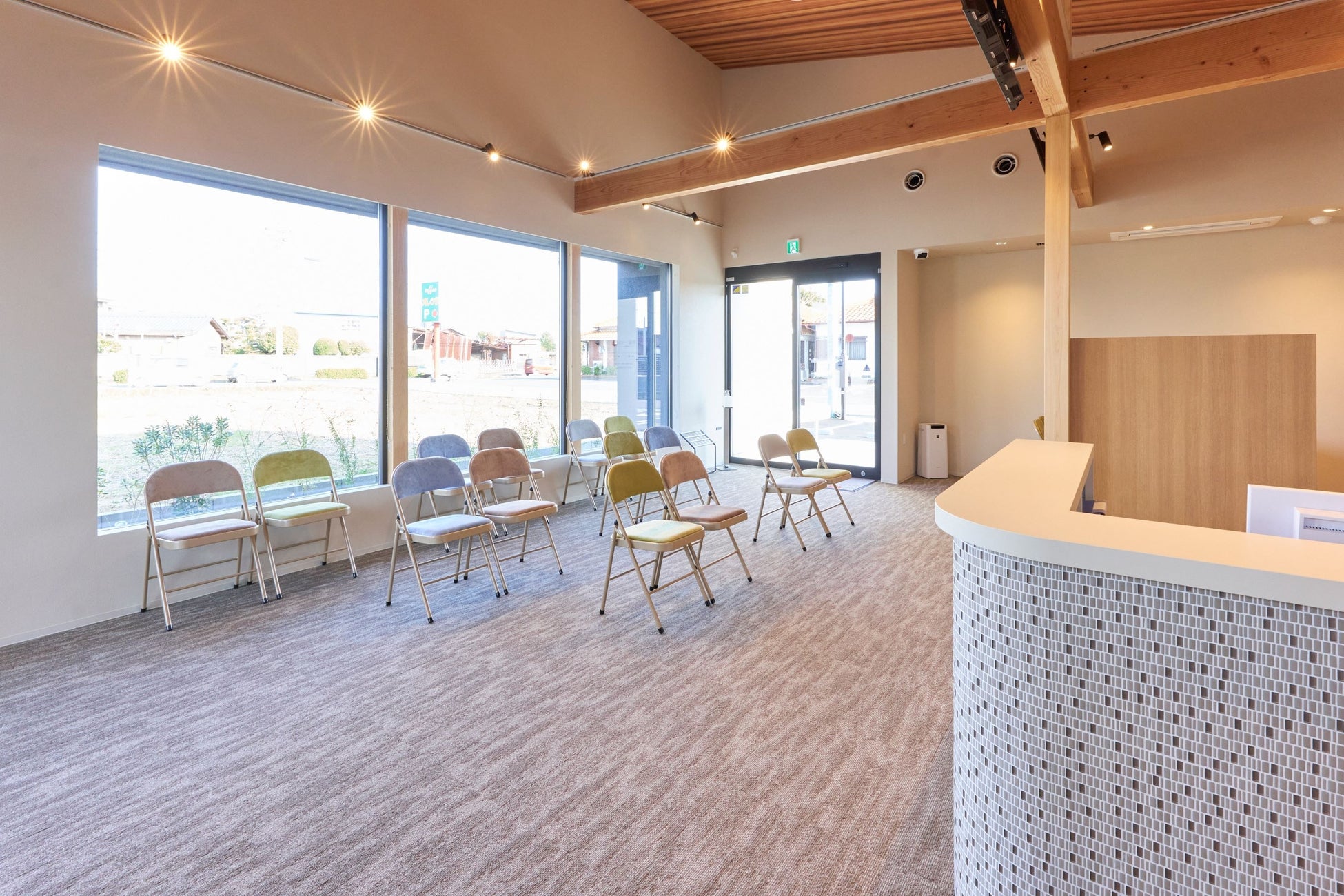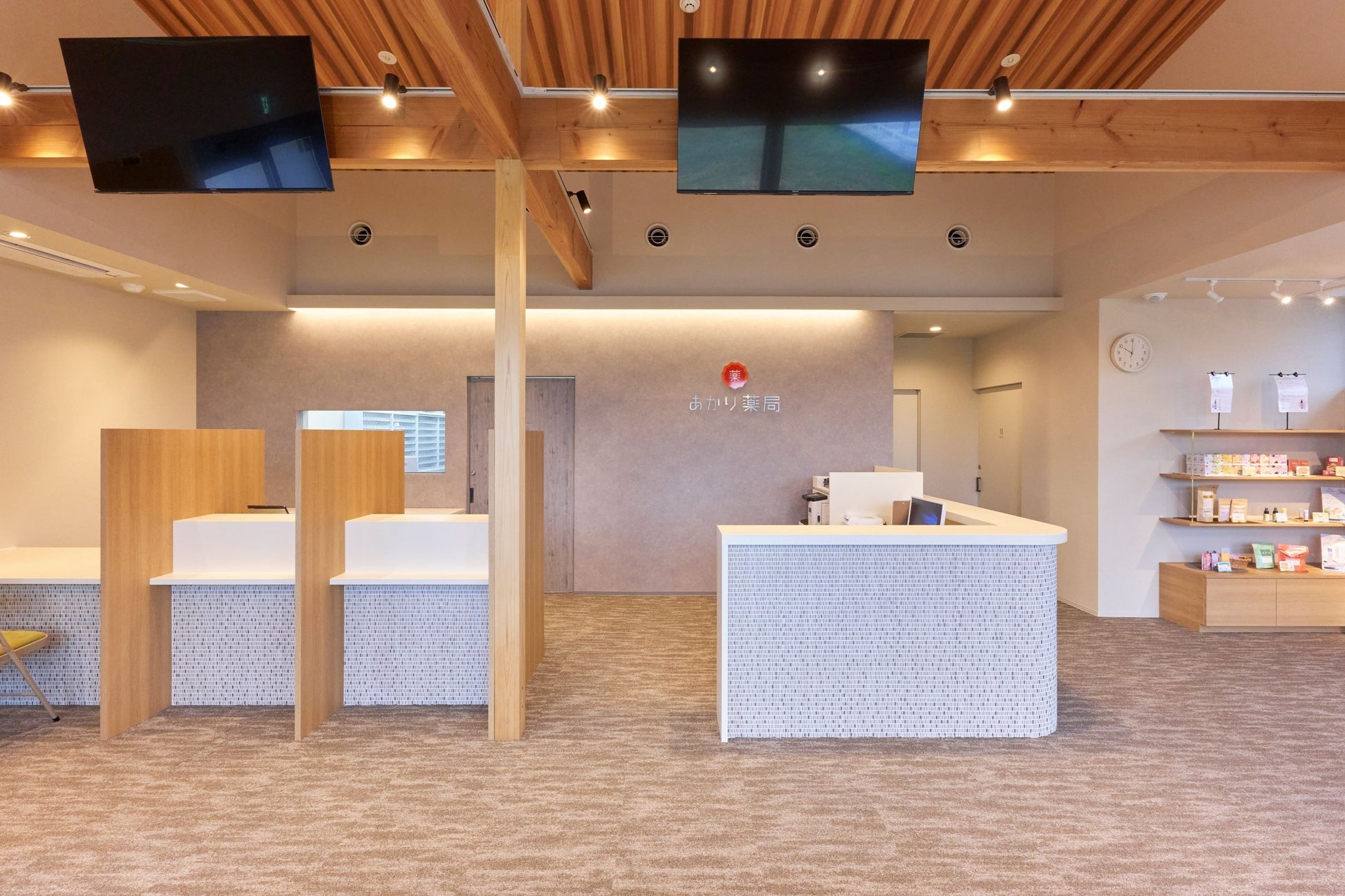 来てくださった皆様に安心と心地よい時間を過ごしてもらえるように、薬局内は空間や色、光の位置などにこだわり、地域の皆様が安らげる場所を意識した待合室になっています。