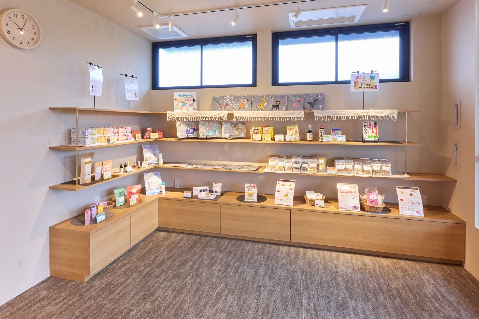 店舗の一角には、健康的なライフスタイルをサポートするための健康グッズやおやつ、サプリメントなども取り揃えております。その中でもグループ会社が作った健康ナッツやデカフェコーヒーは大変好評をいただいている商品になります。