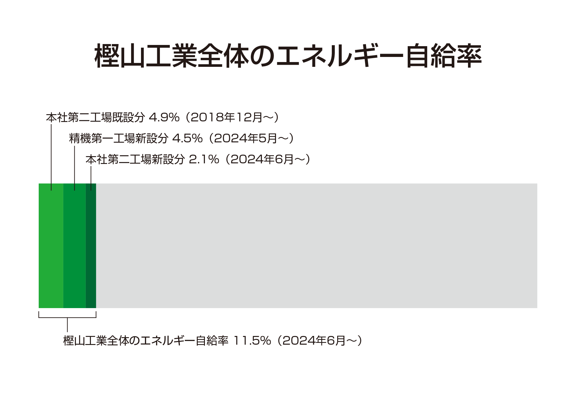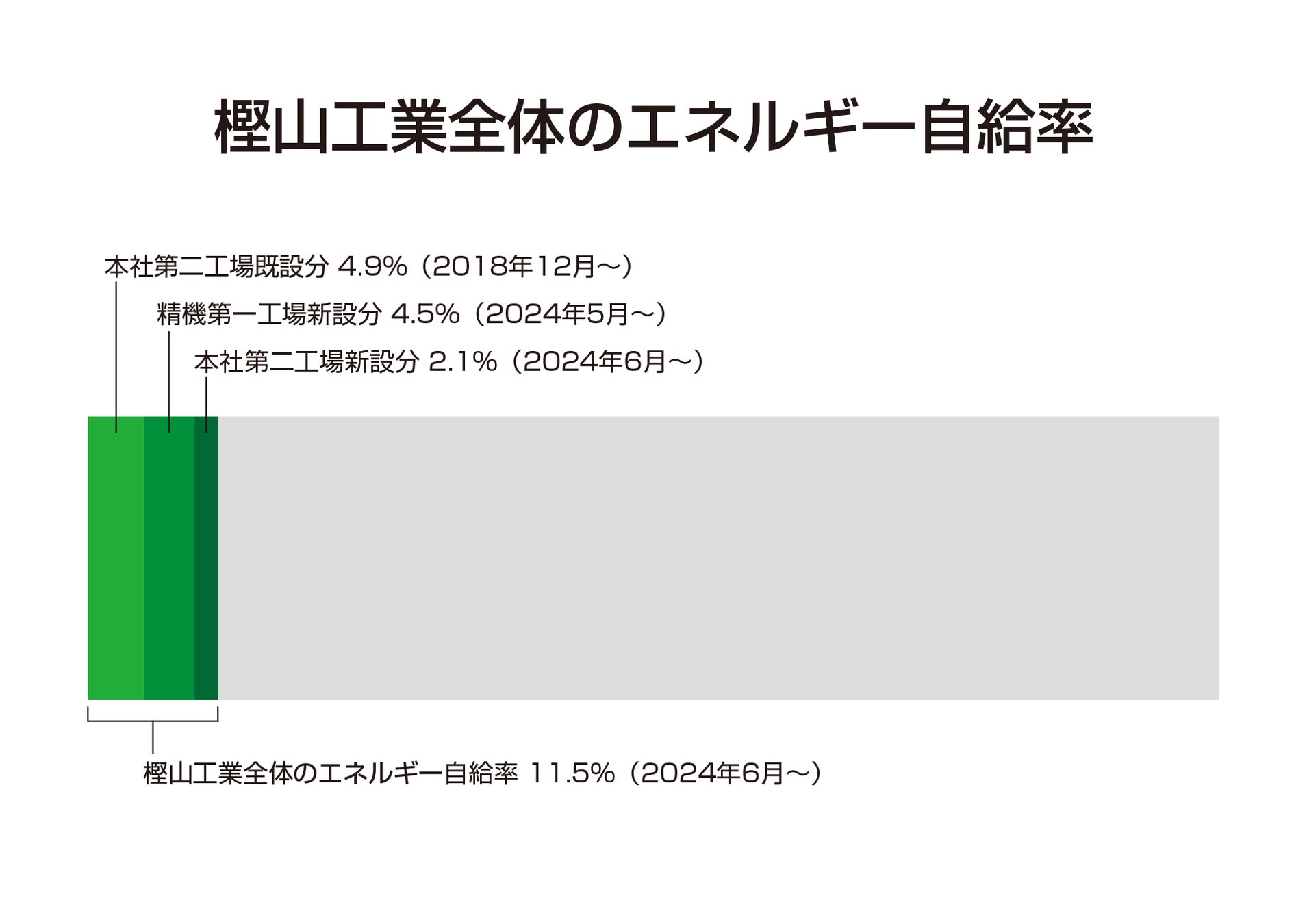5月中旬から精機第一工場の太陽光発電設備が稼働することで、樫山工業全体のエネルギー自給率はこれまでの4.9%から9.4%に向上します。これは社会的課題である電力需給のひっ迫の軽減につながります。