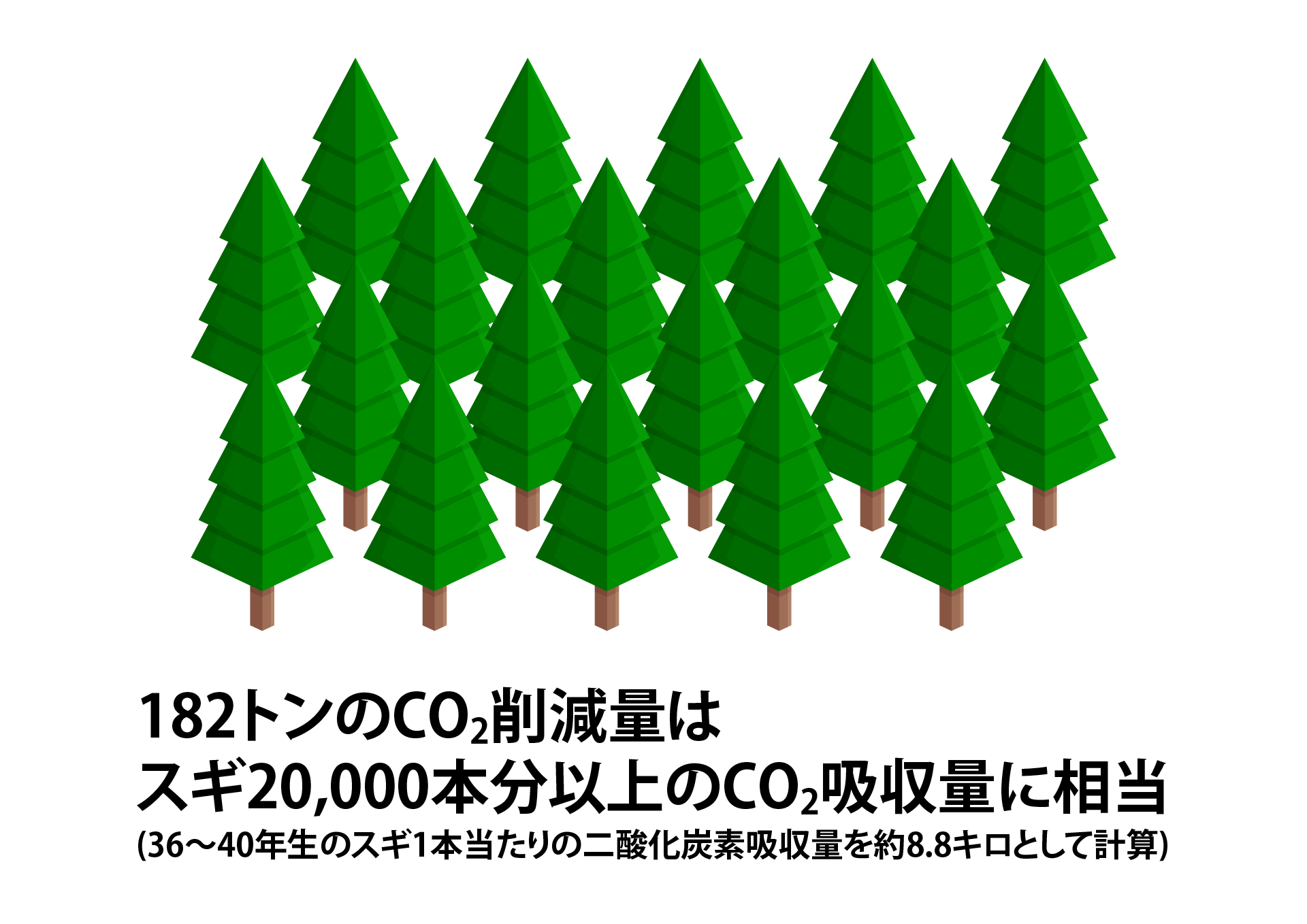 樫山工業が精機第一工場へ導入した設備は太陽光パネルが780枚で、総パネル面積は2,015平方メートル。発電設備のパネル容量は429kW、発電見込み量は470MWh/年。これは精機第一工場における消費電力の10%に相当します。これによりCO₂排出量は年間で約182トン削減される見込みで、大きく成長したスギ20,000本分以上のCO₂吸収量に相当します。