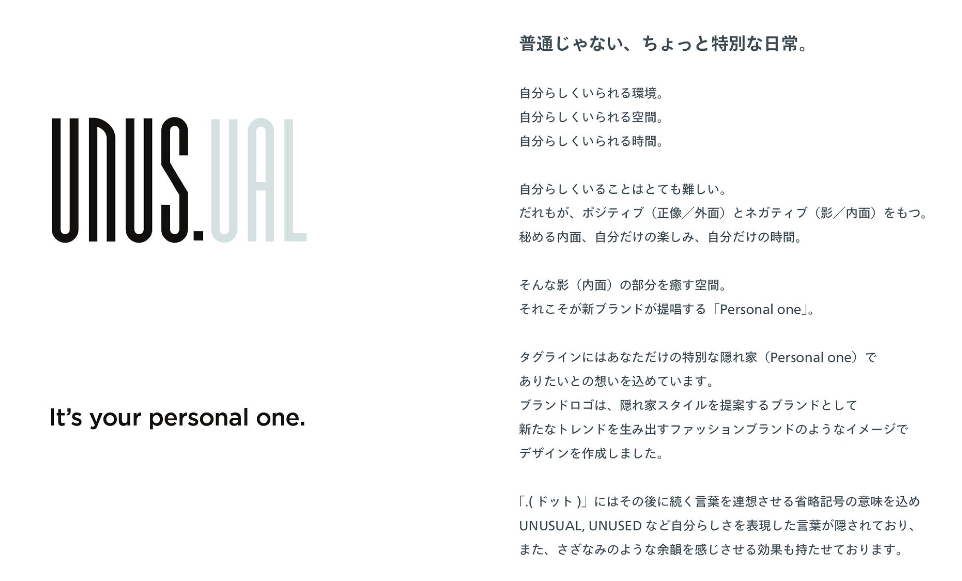 暮らし方も、生き方も、考え方さえも。様々な価値観が変化してきているこの時代に住まいはどのようにあるべきだろうか。こうあるべき、こうでなきゃいけないといった既成概念を解き放ち、自分らしくいられる環境、自分らしくいられる空間、自分らしくいられる時間の創出を目指し、日常(USUAL)と非日常(UNUSUAL)の狭間にある唯一無二の特別な空間を提供していきたいという想いを込めました。