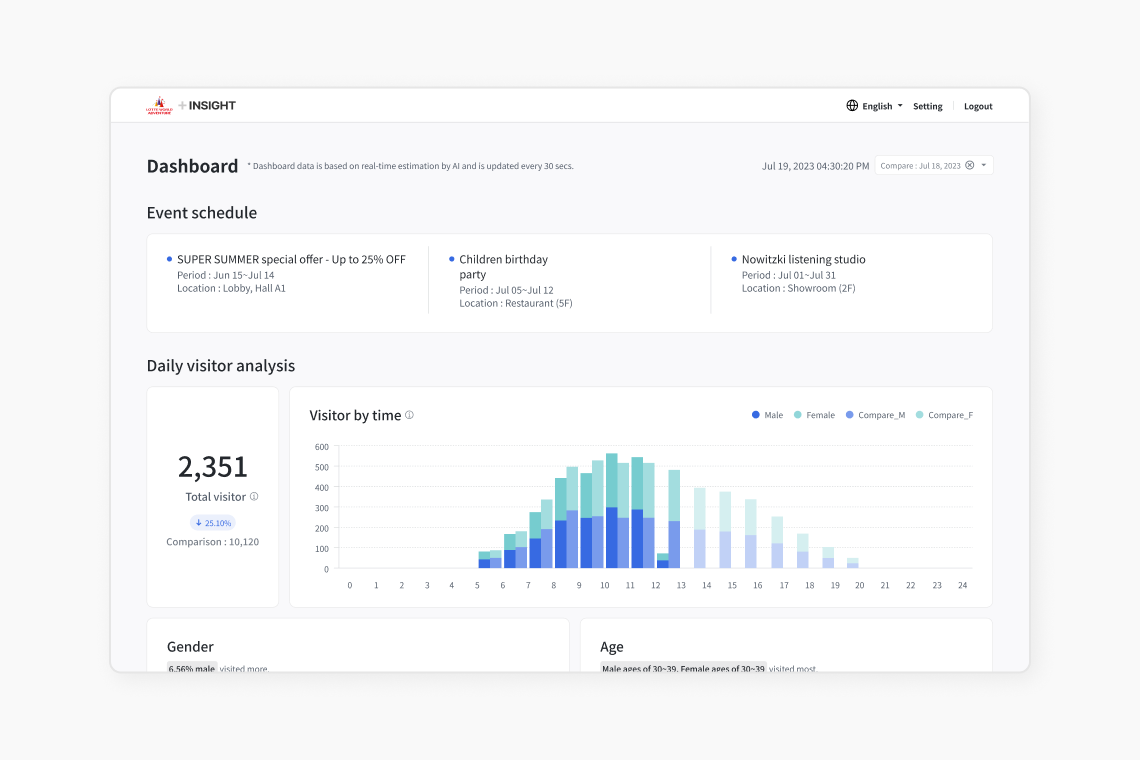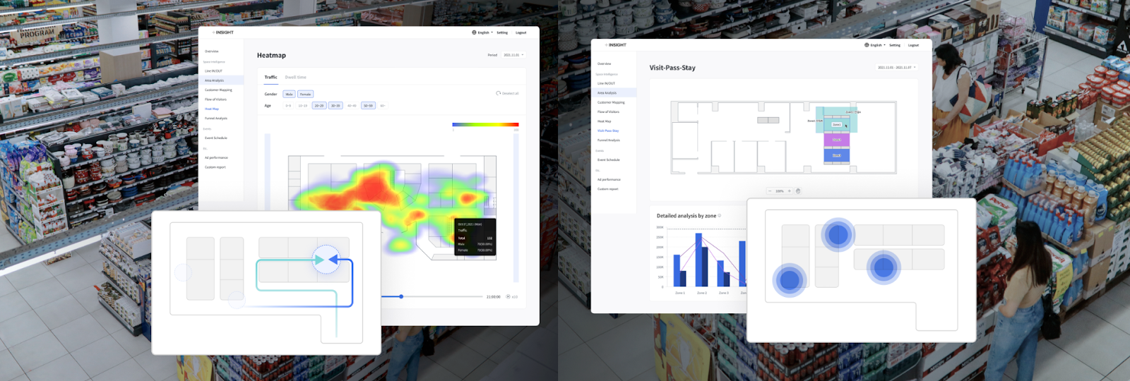 「Retail Care」は、Deeping Sourceが誇る分析・モニタリング技術である「PLUS INSIGHT」と、最新のAI映像認識技術「SEAL」の力を結集しており、防犯カメラを通じて得られる属性および顧客の行動データをリアルタイムで分析し、ダッシュボード上で滞在時間、関心度、行動パターン、導線などの詳細なデータを提供します。効率的な店舗管理と販売促進のためのデータに基づいた導線設計を可能にします。