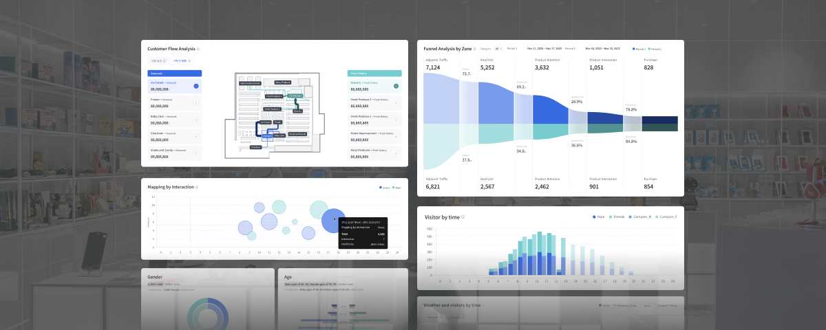 顧客の店内での実際のインタラクションを捉えることで、単なる入店数分析のみならず、顧客がどの商品に興味を持ち、店内のどこに長く滞在するか詳細分析を行います。