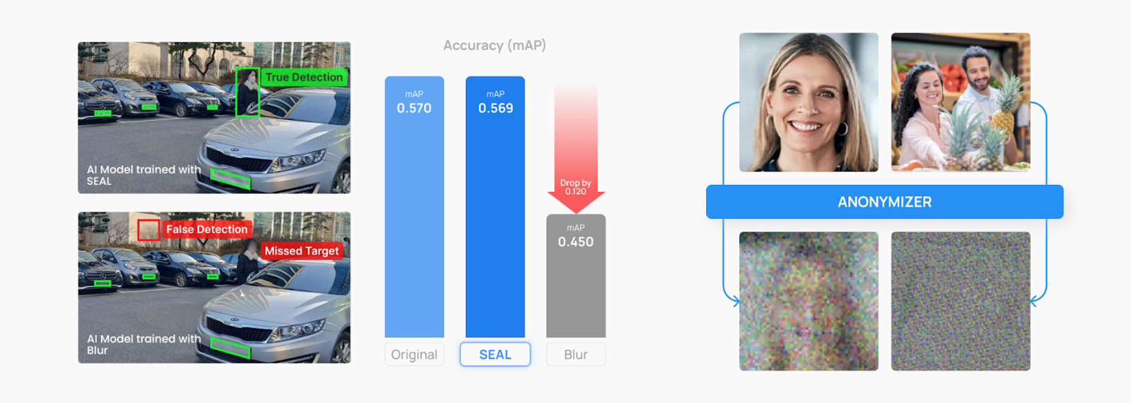 SEALで処理された視覚データを使用してもオリジナルデータと同等の精度保持が可能なため、データのモザイク化やぼかしによるAIデータ利用性の低下を防ぐ事ができます。そのため、プライバシーを重視し、サステナブルなAI技術開発やデータセットの確保を望む世界の主要企業から支持されています。