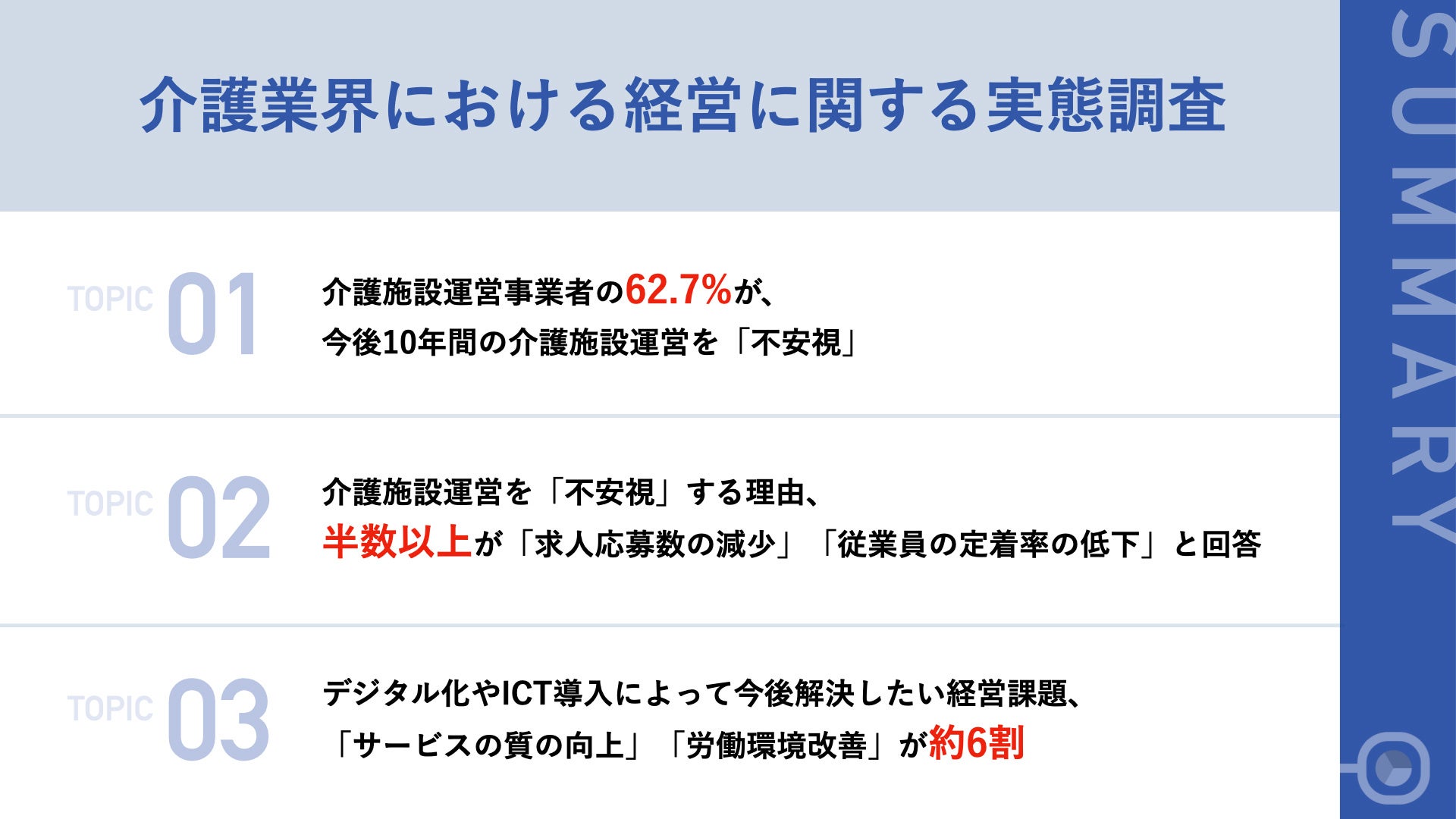 まず、運営している介護施設について、6割以上が、今後10年間の運営を不安視していることが分かりました。その理由には、「従業員の定着率が低いから」や「求人の応募数が減少しているから」が上位に挙げられています。また、運営する介護施設のデジタル化/ICT導入については、45.1%が「できている」と回答しており、そのうちの約6割が「介護の記録をする介護ソフト」や「ペーパーレス化への対応ソフト」を導入しています。さらに、企業存続に向けては「デジタル化やICT導入が重要になる」と約8割が回答しており、デジタル化やICT導入によって、「サービスの質の向上」(59.7%)や、「労働環境の改善」(58.7%)を今後解決したい経営課題として挙げました。
