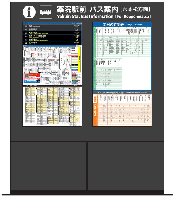【表示内容】 時刻表、運賃表、路線図、バス接近案内、お客さま向け告知文 など