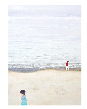 実際の景色を眺めるように絵をぼんやりと見つめていると、意図的にピントのズレを生じさせた絵画表現の効果によって視覚的に柔らかさを感じながら、作品の中にあるいくつかの事象やモチーフへと視点は移行する。同時に思考は現実世界と切り離されるような感覚を覚える。そして、しばしば登場する性別や表情が明確ではない人物は、「誰とも分かち合えない寂しさ」に対峙し続ける作家自らであり、また作品の前にいる鑑賞者を投影している。すなわち作品に関与する者たちを作中で間接的に同居させる、あるいは作家の視点に鑑賞者が追体験するための手立てとなっている。