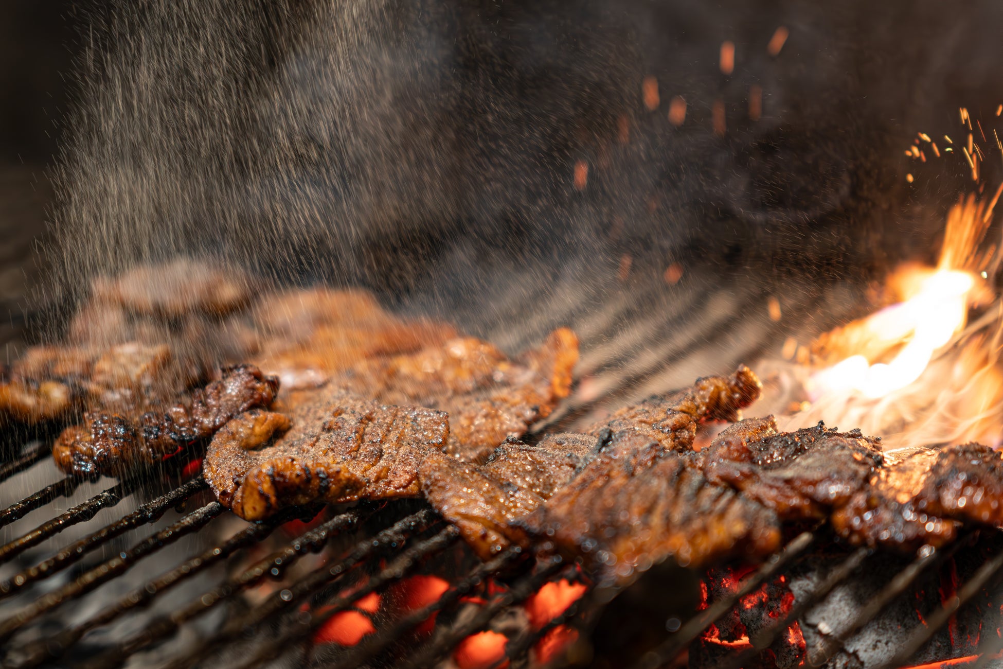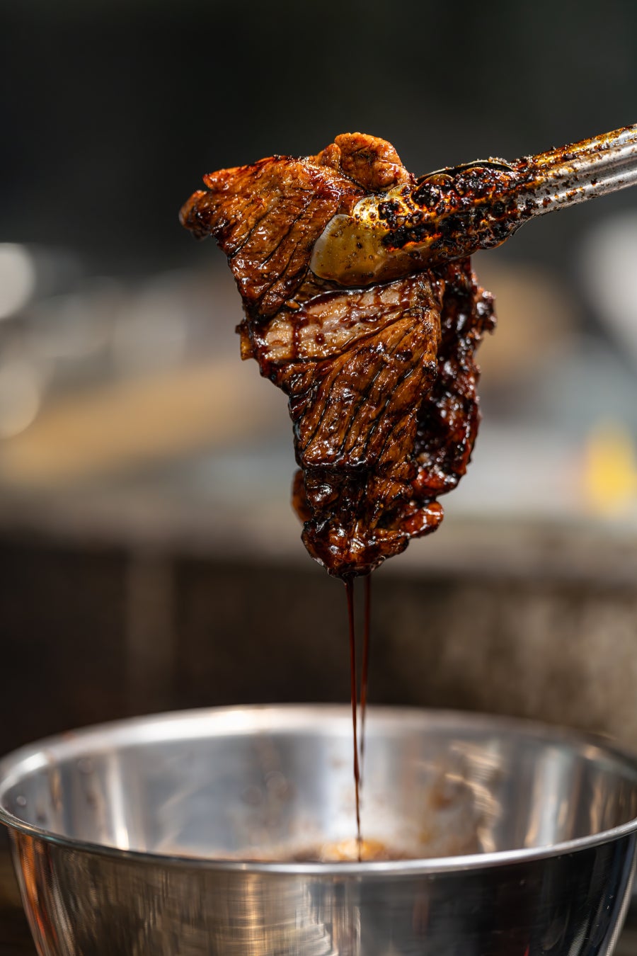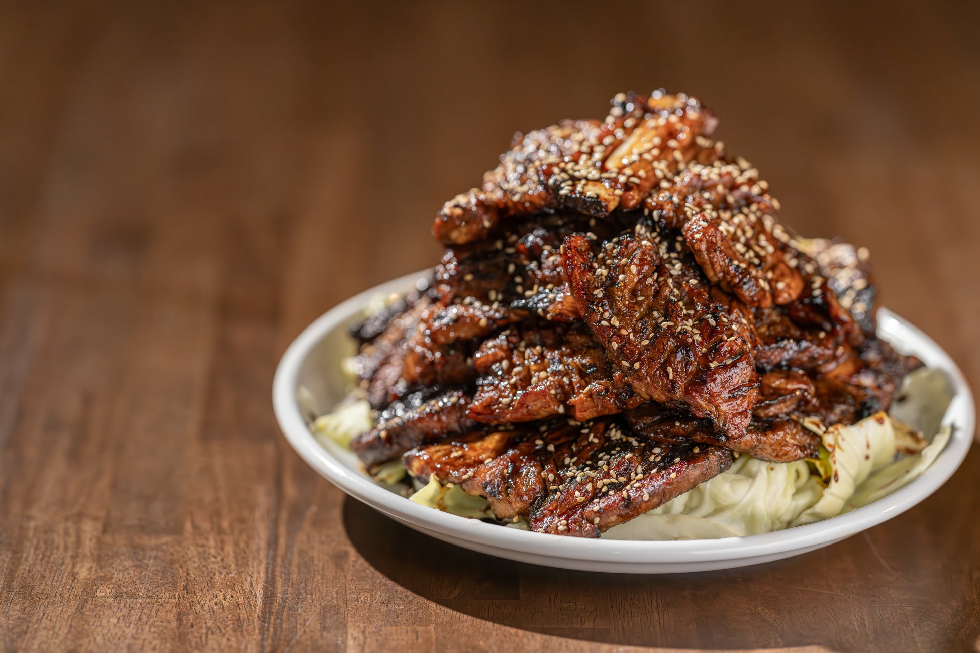 焼き上がった骨付きカルビに本格タレとブラックペッパーをたっぷりかけて提供します。