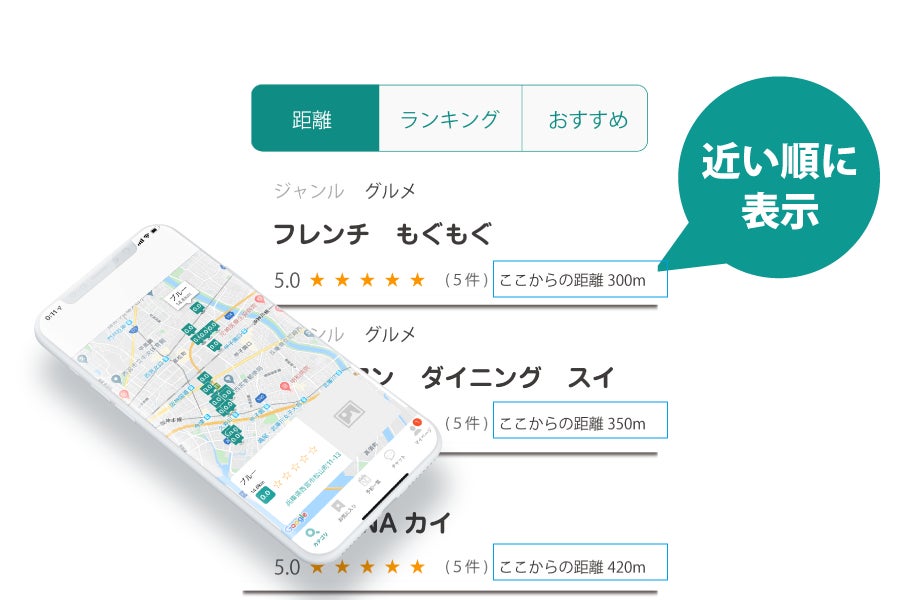 “今いる場所”から「近い順に表示」機能を利用してお店を探すことができます。どの場所にいても、自分の位置情報から近い順で上位表示をしてくれます。混雑状況もお店が登録すれば知ることができます。例えば、14時10分にランチボタンを押すと、14時まで営業のお店や定休日のお店は除外して表示されます。