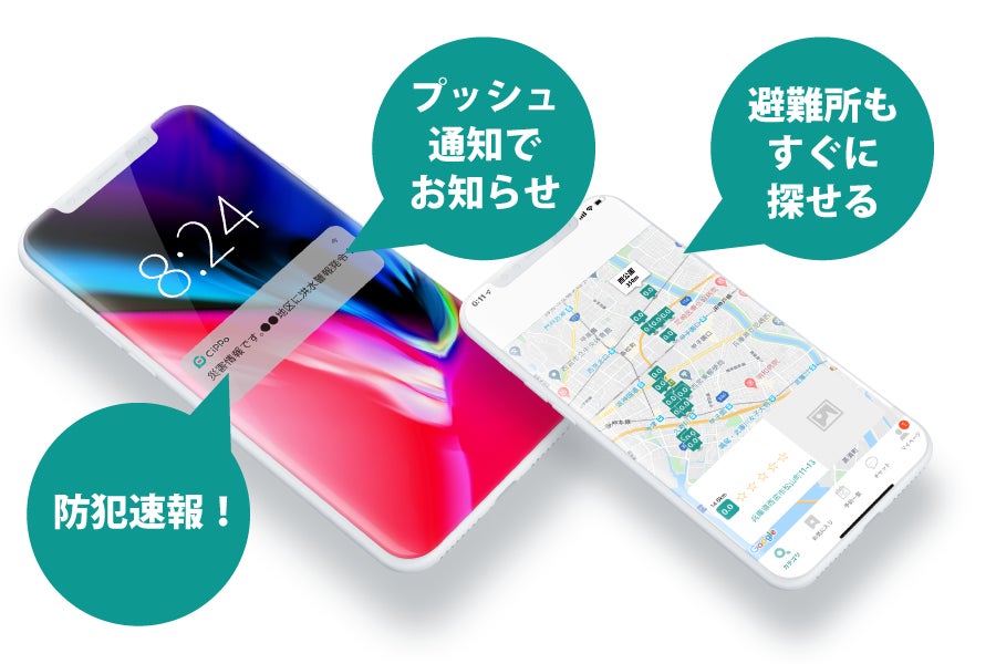 災害時や防犯情報も、「川沿いにいる方だけ」や「駅前にいる方のみ」に別々の情報をプッシュ通知で知ることができます。子供や高齢者が家族にSOSを送れたり、位置情報を把握するシステムも備えています。