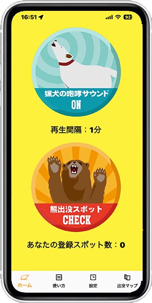 アラートでお知らせする機能※このアプリはクマを撃退するものではありません。アラートが鳴りましたら「猟犬の咆哮」音を再生し速やかに避難してくだい。
