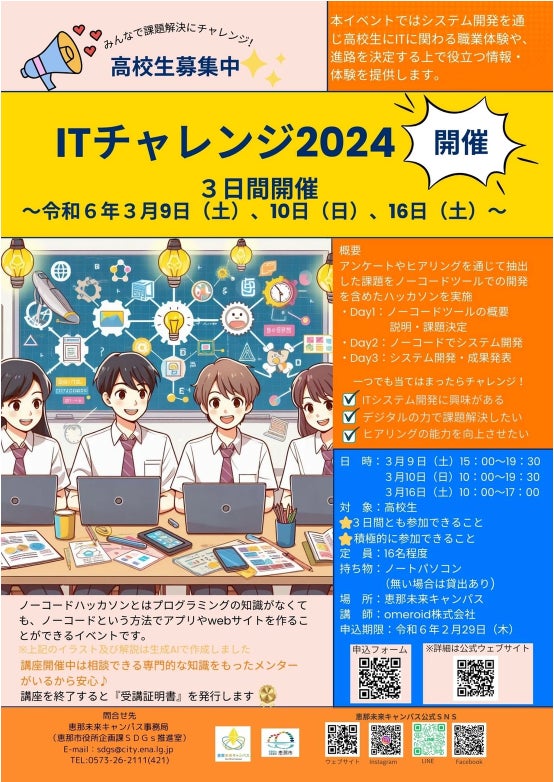 恵那市の「未来」を創る人材を育てる学びの場をミッションに掲げる、恵那未来キャンパス企画会議(事務局:岐阜県恵那市長島町正家一丁目1番地1 本庁舎3階 恵那市役所まちづくり企画部SDGs推進室)とomeroid株式会社は2024年3月9日~16日、「地域の課題を解決するアプリをノーコードでつくる」をコンセプトに『ITチャレンジ2024』を開催しました。