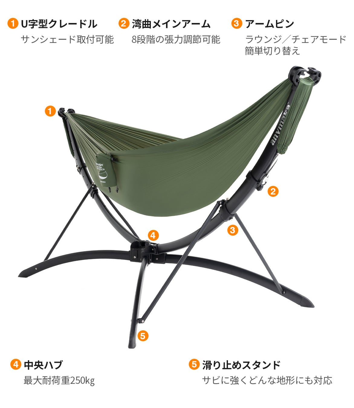 設置が面倒なハンモックの常識を打破した、3秒で設置できる本格的なファミリーサイズハンモックスタンドが、アウトドアはもちろん、庭先や家の中でも、いつでも瞬時にリラックスタイムをご提供します。