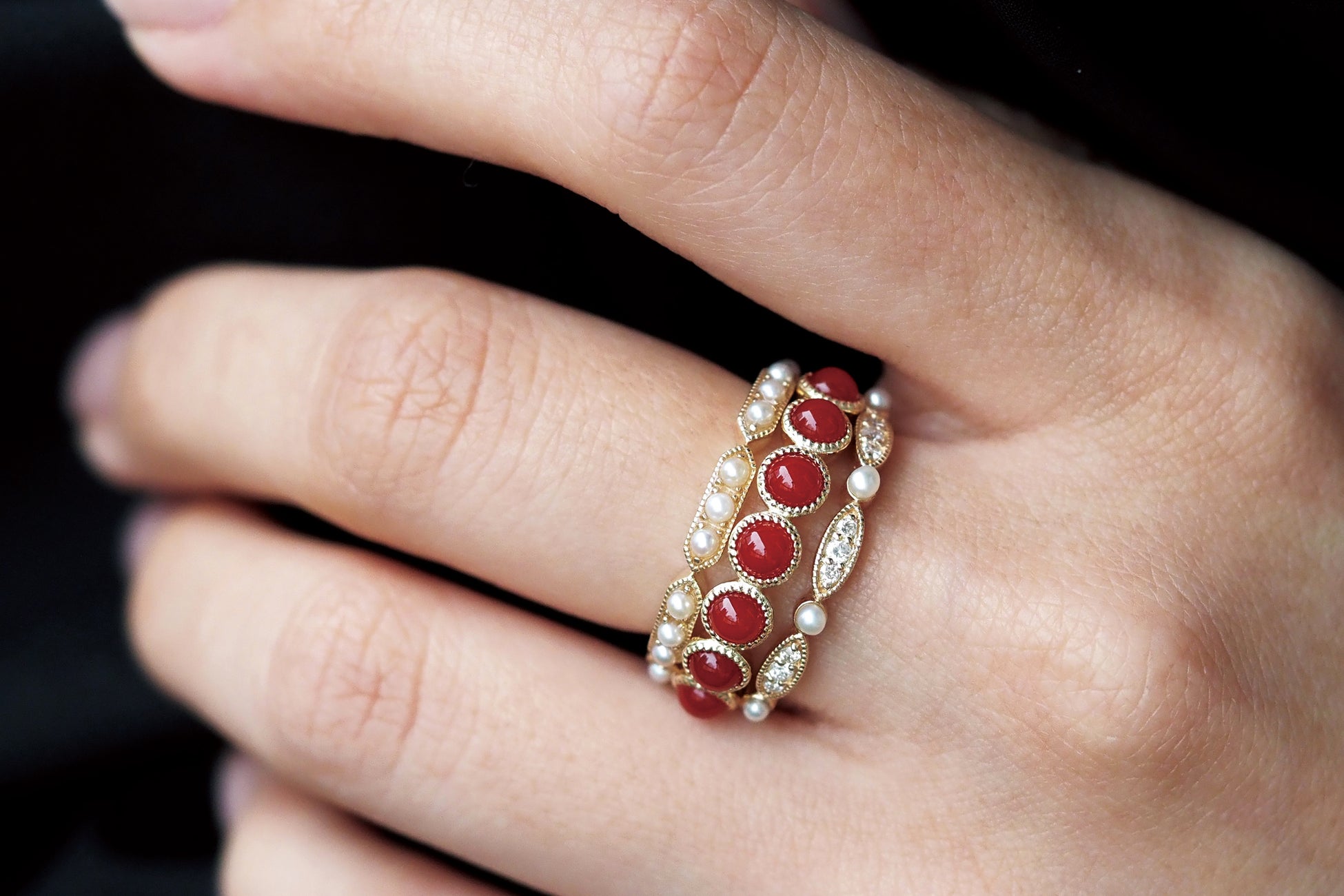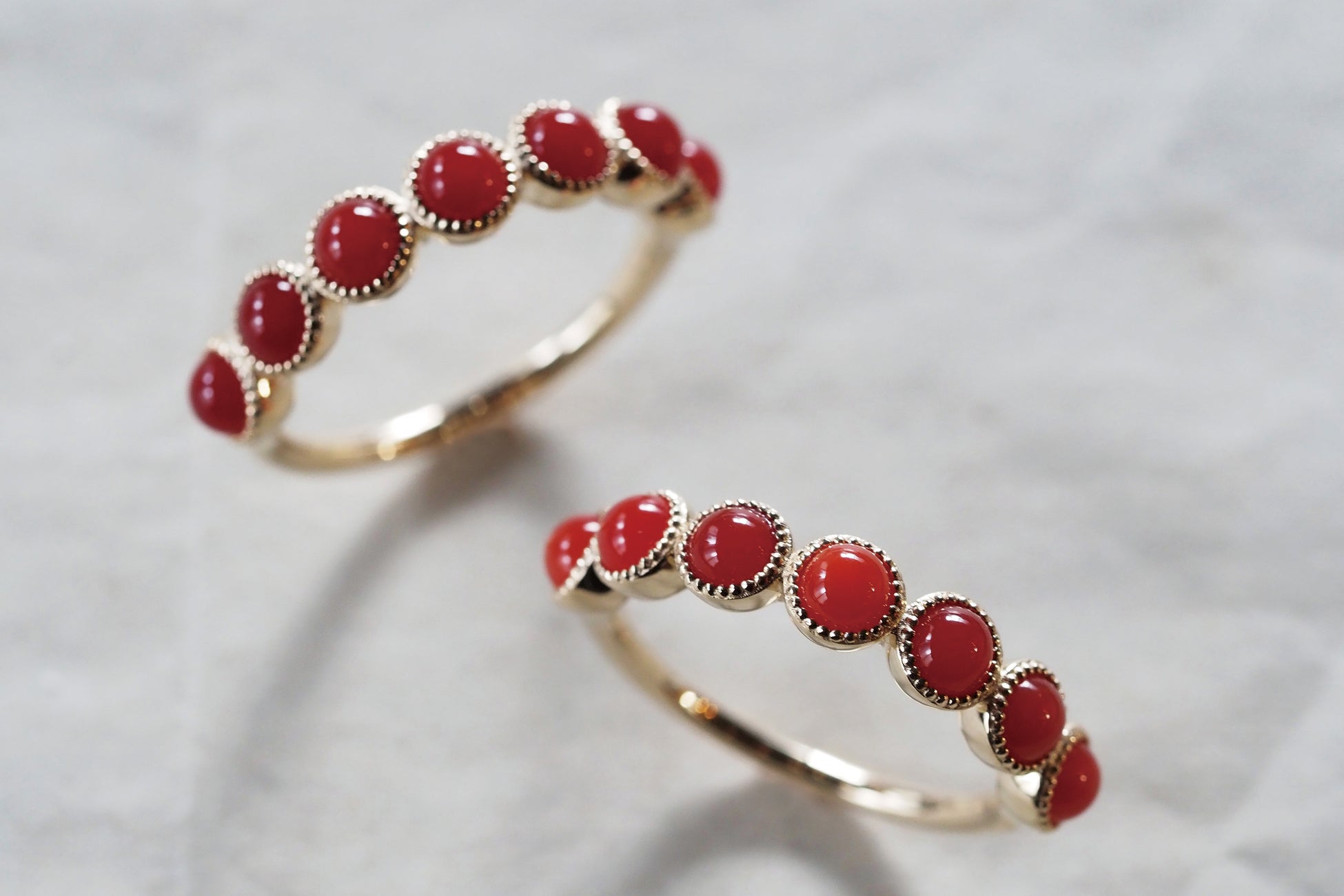血赤珊瑚 Mille Chainonは、珍しいカボションカットの高知県産血赤珊瑚をミル留めしました。通常、珊瑚は丸珠か小判と呼ばれる形状にカットされます。