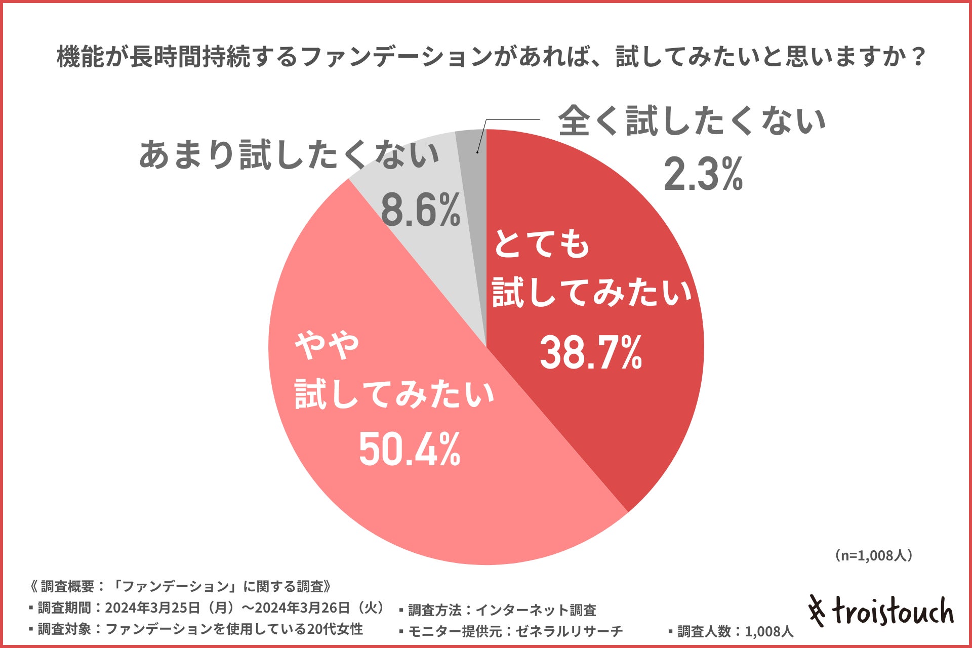 「機能が長時間持続するファンデーションがあれば、試してみたいと思いますか?(単一回答))」と質問したところ、約9割の方が、『とても試してみたい(38.7%)』『やや試してみたい(50.4%)』と回答しました。