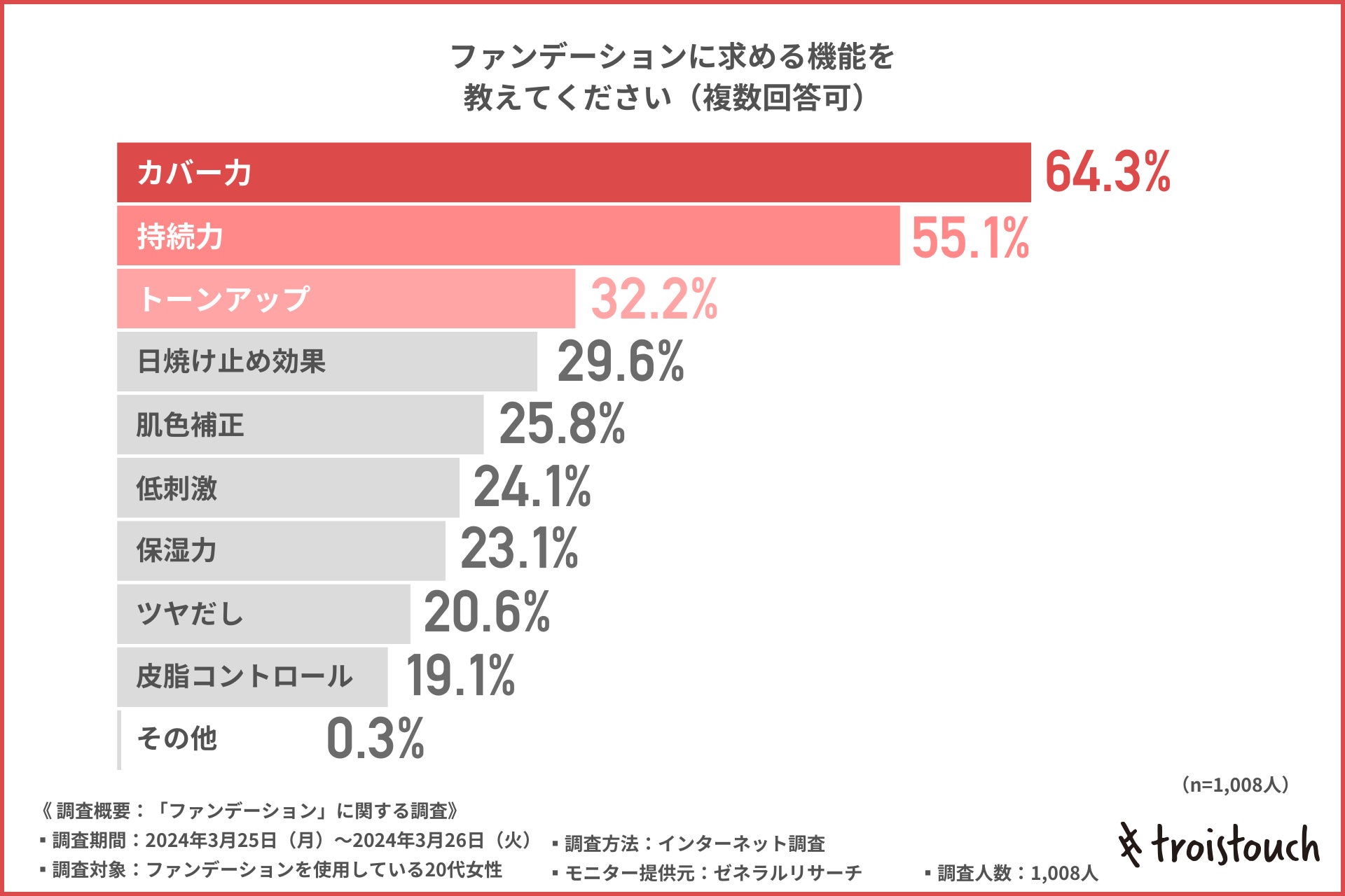 そこで、「ファンデーションに求める機能を教えてください(複数回答可)」と質問したところ、『カバー力(64.3%)』と回答した方が最も多く、次いで『持続力(55.1%)』『トーンアップ(32.2%)』と続きました。