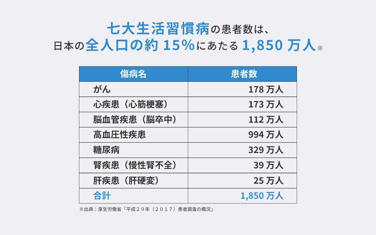 ●七大生活習慣病の患者数は、日本の全人口の約15%にあたる1,850万人